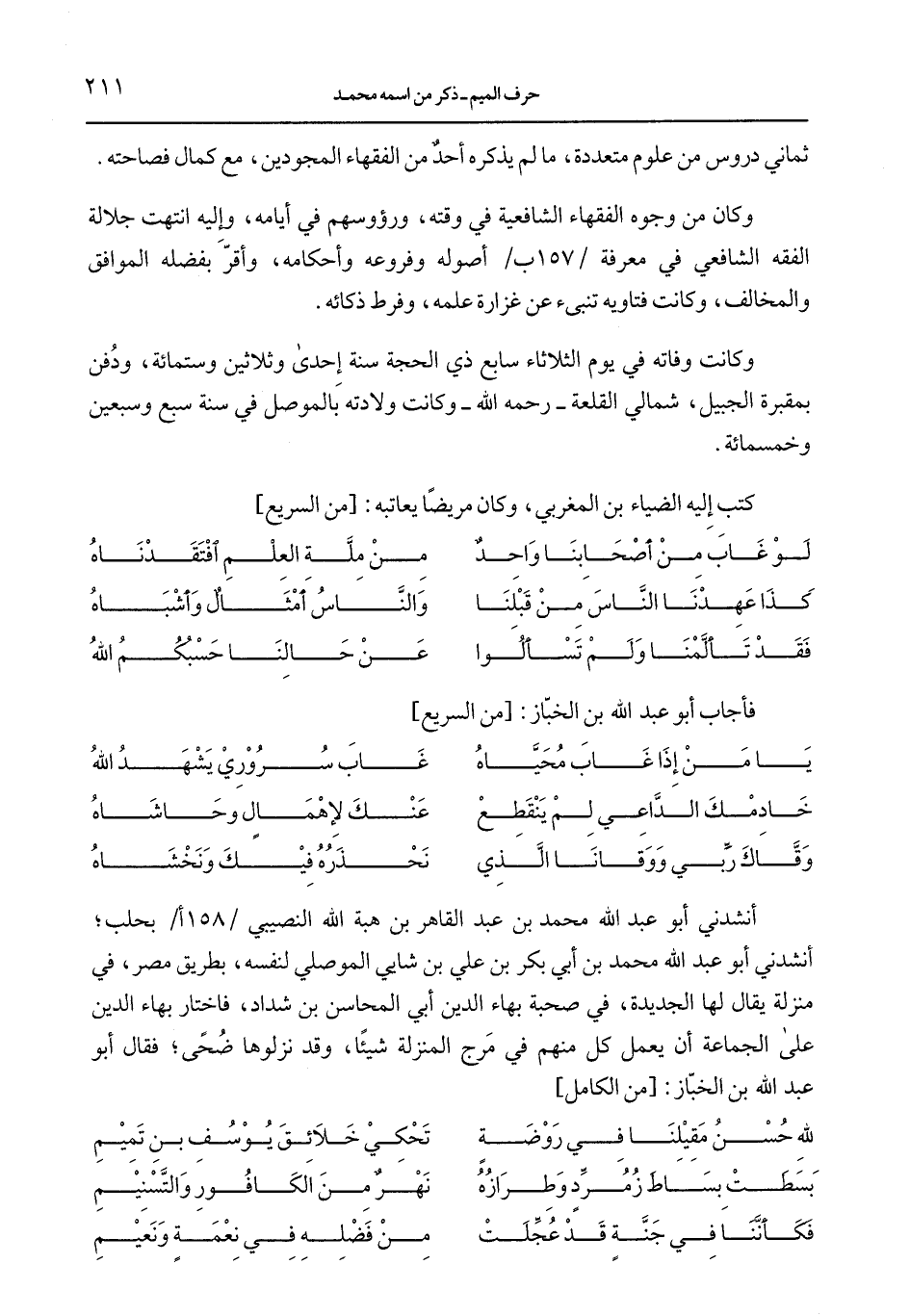 أنشدني أبو عبد الله محمد بن عبد القاهر بن هبة الله النصيبي بحلب، أنشدني أبو عبد الله محمد بن أبي بكر بن علي بن شابي الموصلي لنفسه، بطرق مصر، في منزلة يقال لها الجديدة، في صحبة بهاء الدين أبي المحاسن بن شداد، فاختار بهاء الدين علي الجماعة أن يعمل كل منهم في مرج المنزلة شيئًا، وقد نزلوها ضحى، فقال أبو عبد الله بن الخباز: ] من الكامل [