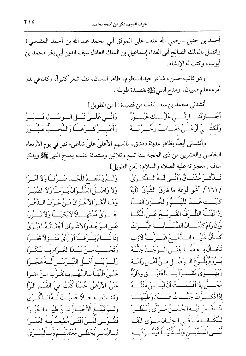 وأنشدني أيضًا بظاهر مدينة دمشق، بالسهم الأعلى على شاطئ نهر في يوم الأربعاء الخامس والعشرين من ذي الحجة سنة تسع وثلاثين وستمائة لنفسه يمدح النبي صلى الله عليه وسلم ويذكر مناقبه ومعجزاته عليه الصلاة والسلام: [من الطويل]