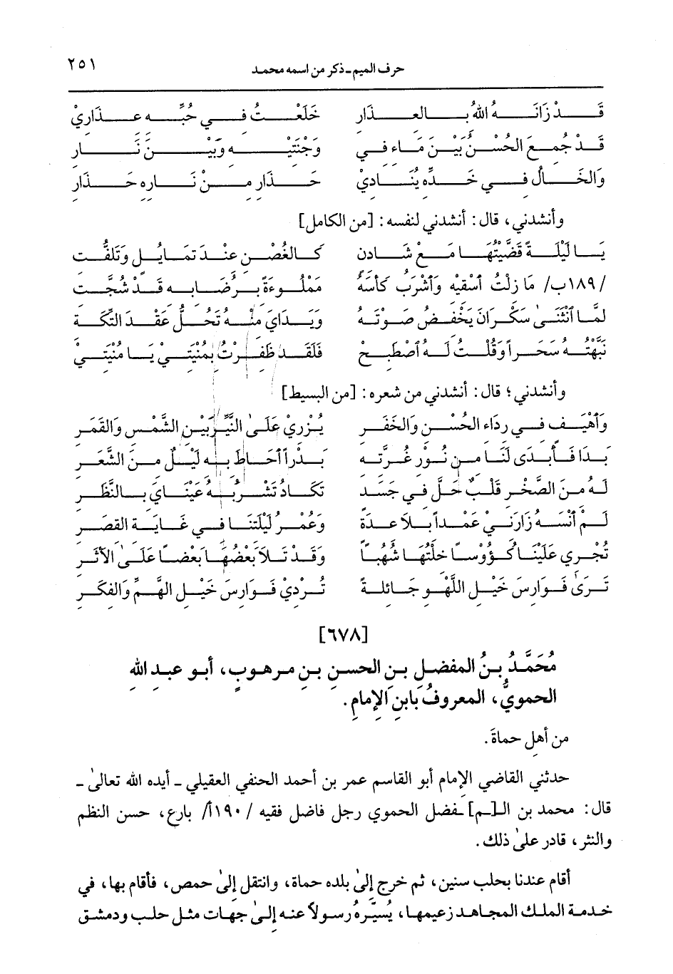 حدثني القاضي الإمام أبو القاسم عمر بن أحمد الحنفي العقيلي- أيده الله تعالى- قال: محمد بن الـ[ـم]ـفضل الحموي رجل فاضل فقيه/ 190 أ/ بارع، حسن النظم والنثر، قادر على ذلك.