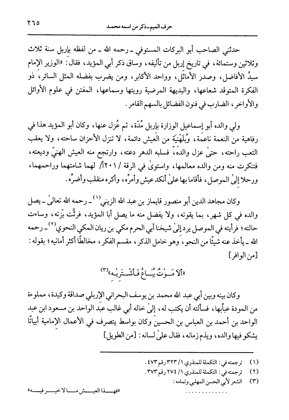 ولي والده أبو إسماعيل الوزارة بإربل مدّة، ثم عزل عنها، وكان أبو المؤيد هذا في رفاهية من النعمة ناعمة، وبلهنيةٍ من العيش دائمة، لا تنزل الأحزان ساحته، ولا يعقب التعب راحته، حتى عزل والده، فسلبه الدهر دعته، وارتجع منه العيش الهنيّ وديعته، فتنكرت منه ومن والده معالمها، واستوى في الرقة/ 201 أ/ لهما شامتهما وراحمهما، ورحلا إلى الموصل، فأقاما بها على أنكد عيش وأمِّره، وأكره منقلب وأضرِّه.