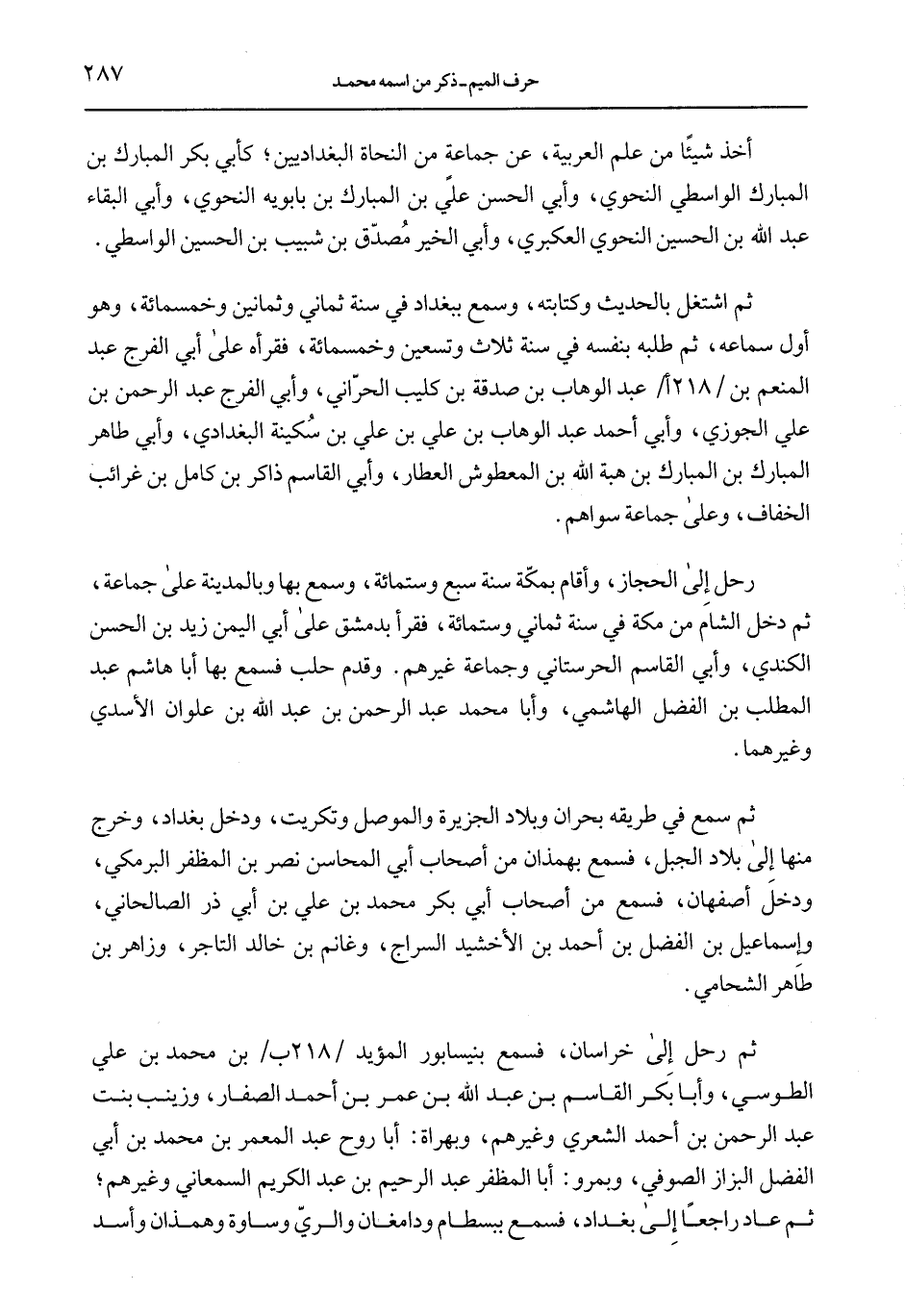ثم رحل على خراسان، فسمع بنيسابور المؤيد/ 218 ب/ ب محمد بن علي الطوسي، وأبا بكر القاسم بن عبد الله بن عمر بن أحمد الصفار، وزينب بنت عبد الرحمن بن أحمد الشعري وغيرهم، وبهراة: أبا روح عبد المعمر بن محمد بن أبي الفضل البزاز الصوفي، وبمرو: أبا المظفر عبد الرحيم بن عبد الكريم السمعاني وغيرهم؛ ثم عاد راجعًا إلى بغداد، فسمع ببسطام ودامغان والريّ وساوة وهمذان وأسد