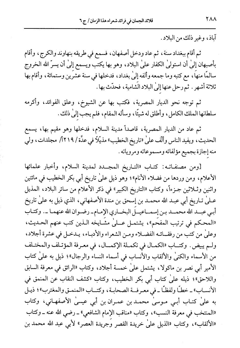 ثم عاد من الديار المصرية، قاصدًا مدينة السلام، فدخلها وهو مقيم بها، يسمع الحديث، ويفيد الناس وألّف على ((تاريخ الخطيب)) مذيّلًا في عدَّة/ 219 أ/ مجلدات، ولي منه إجازة بجميع مؤلفاته ومسموعاته ومروياته.