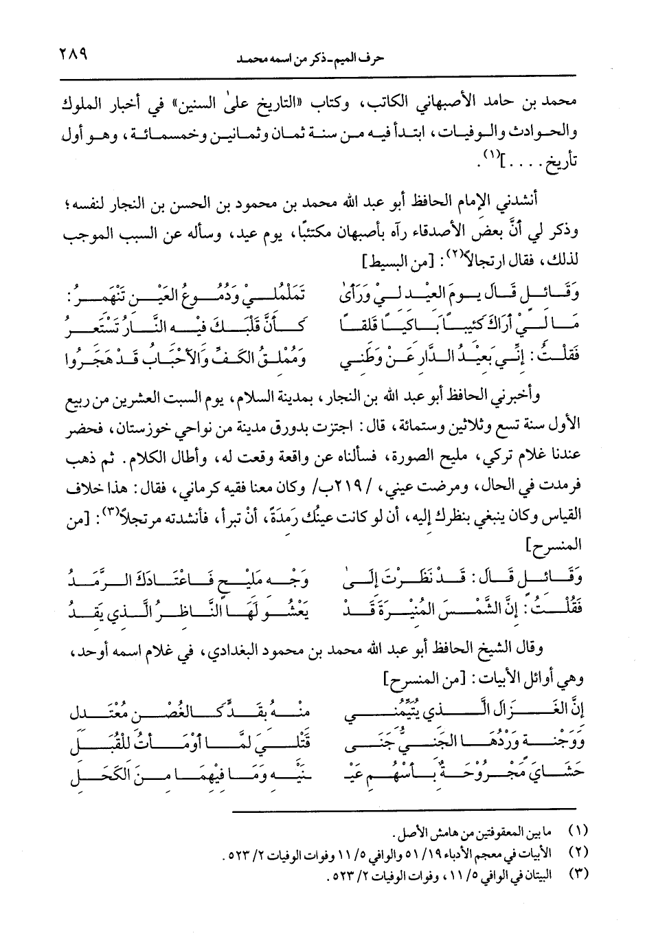 أنشدني الإمام الحافظ أبو عبد الله محمد بن محمود بن الحسن بن النجار لنفسه؛ وذكر لي أنَّ بعض الأصدقاء رآه بأصبهان مكتئبًا، يوم عيد، وسأله عن السبب الموجب لذلك، فقال ارتجالًا: [من البسيط]