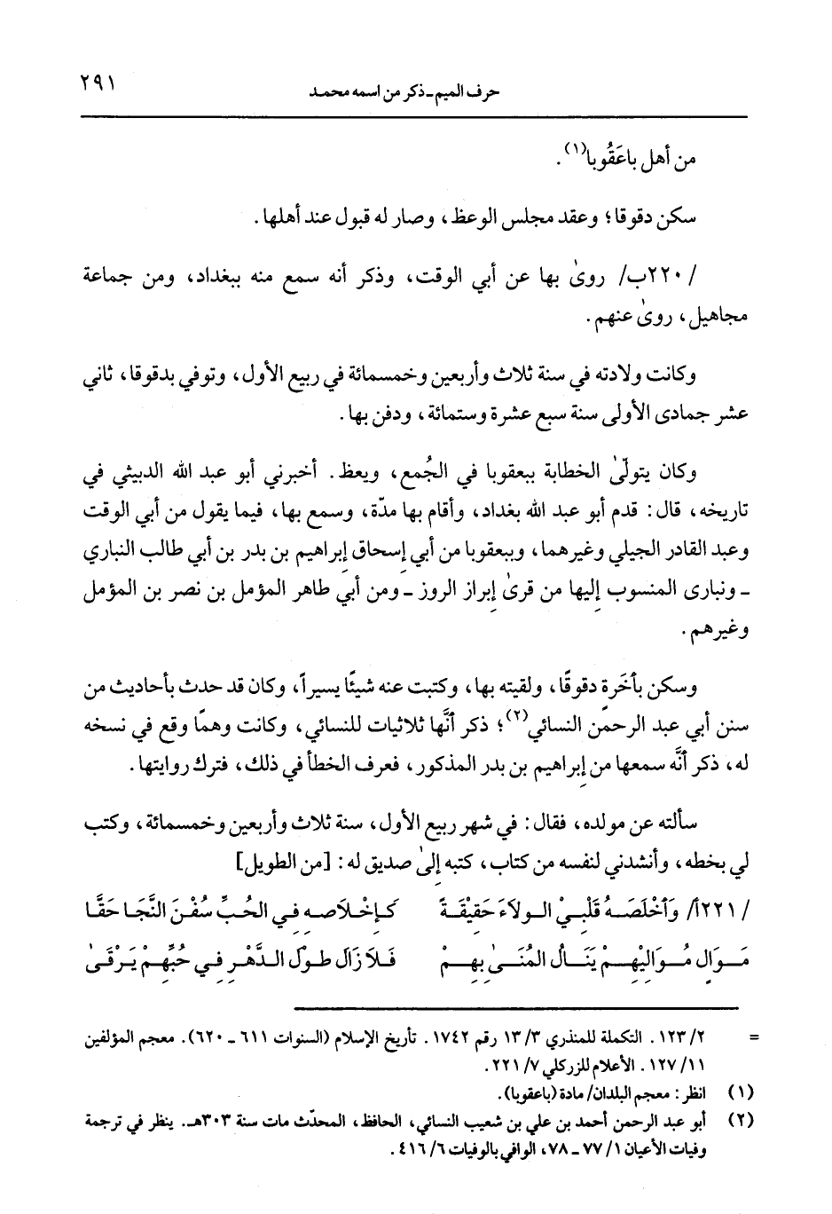 وسكن بأخرةٍ دقوقًا، ولقيته بها، وكتبت عنه شيئًا يسيرًا، وكان قد حدث بأحاديث من سنن أبي عبد الرحمن النسائي؛ ذكر أنها ثلاثيات للنسائي، وكانت وهما وقع في نسخه له، ذكر أنَّه سمعها من إبراهيم بن بدر المذكور، فعرف الخطأ في ذلك، فترك روايتها.