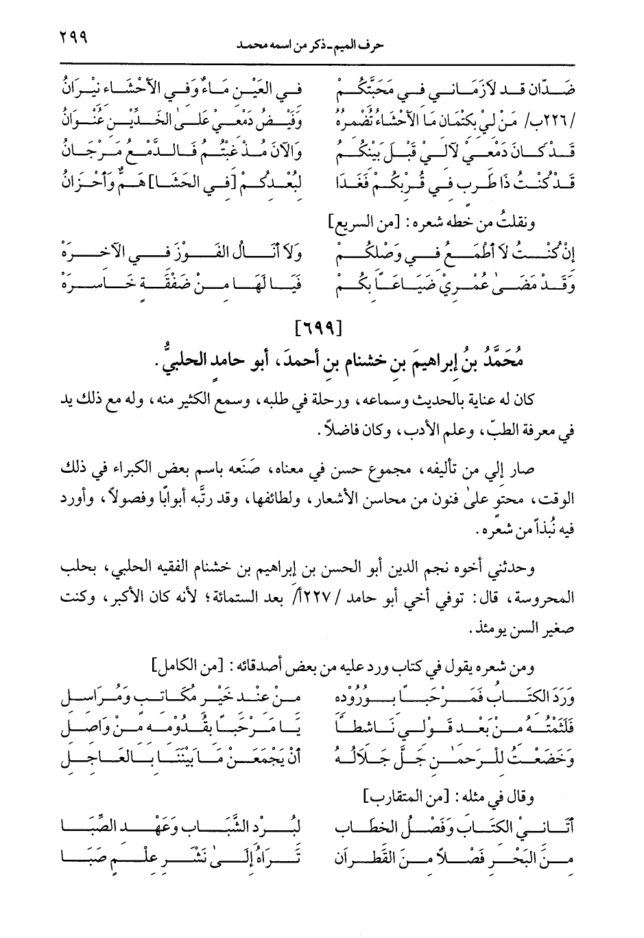 وحدثني أخوه نجم الدين أبو الحسن بن إبراهيم بن خشنام الفقيه الحلبي، بحلب المحروسة، قال: توفي أخي أبو حامد/ 227 أ/ بعد الستمائة؛ لأنه كان الأكبر، وكنت صغير السن يومئذ.