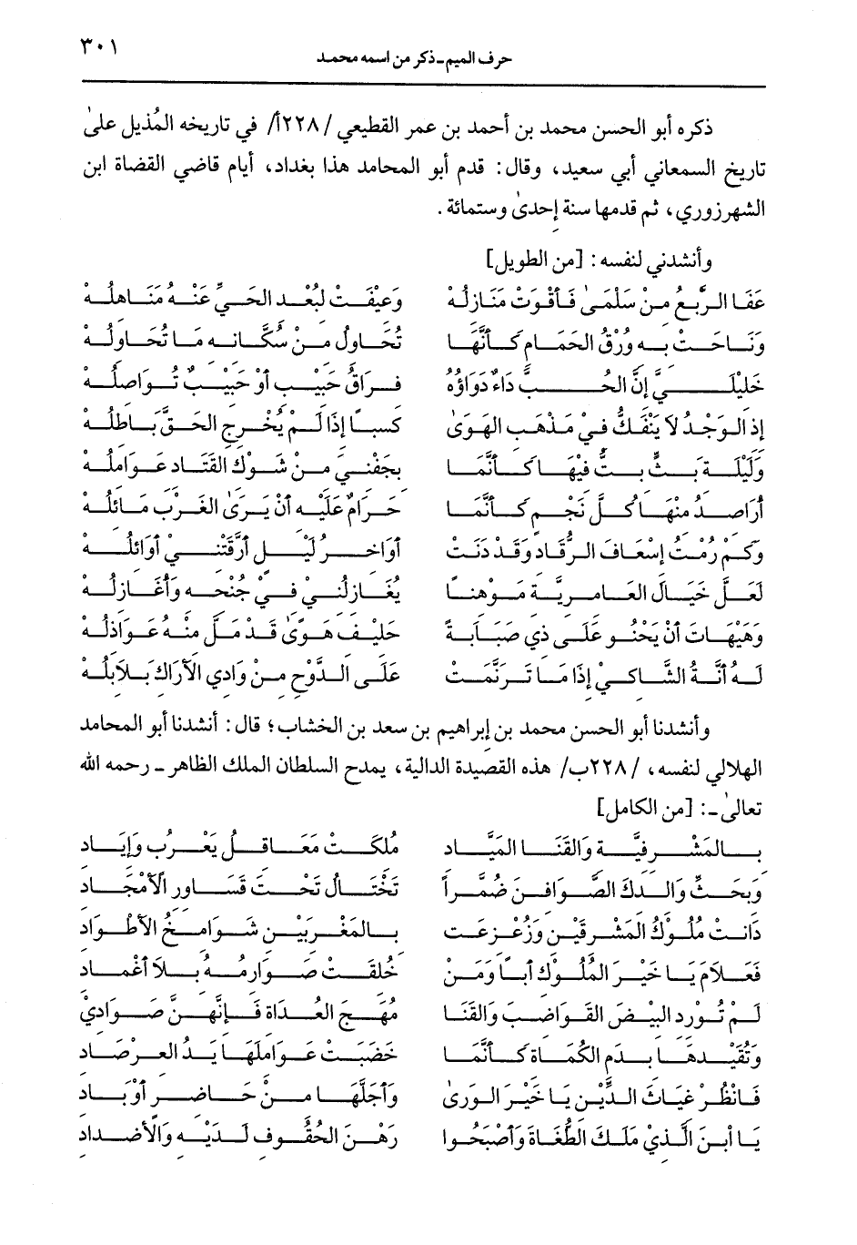 وأنشدنا أبو الحسن محمد بن إبراهيم بن سعد بن الخشاب؛ قال: أنشدنا أبو المحامد الهلالي لنفسه، / 228 ب/ هذه القصيدة الدالية، يمدح السلطان الملك الظاهر- رحمه الله تعالى-: [من الكامل]