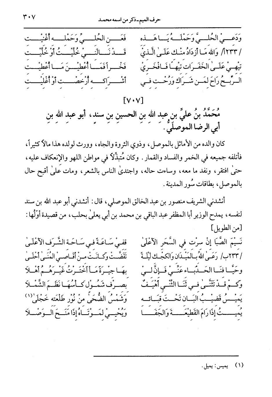أنشدني الشريف منصور بن عبد الخالق الموصلي، قال: أنشدني أبو عبد الله بن سند لنفسه، يمدح الوزير أبا المظفر عبد الباقي بن محمد بن أبي يعلى بحلب، من قصيدة أوّلها: [من الطويل]