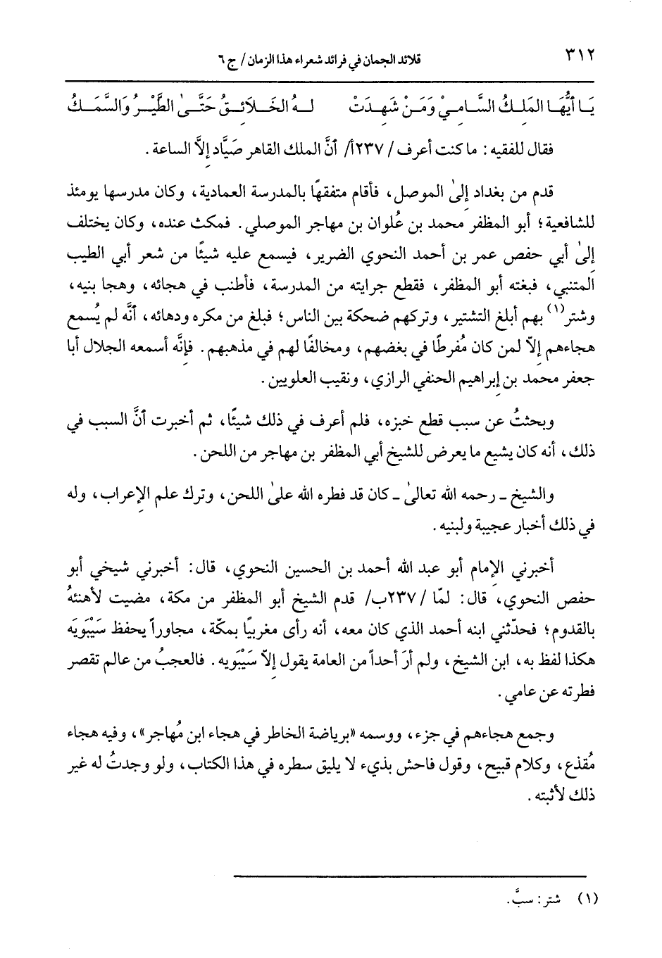 أخبرني الإمام أبو عبد الله أحمد بن الحسين النحوي، قال: أخبرني شيخي أبو حفص النحوي، قال: لما: 237 ب/ قدم الشيخ أبو المظفر من مكة، مضيت لأهنئه بالقدوم؛ فحدثني ابنه أحمد الذي كان معه، أنه رأى مغربيًا بمكّة، مجاورًا يحفظ سيبويه هكذا لفظ به، ابن الشيخ، ولم أر أحدًا من العامة يقول إلّا سيبويه. فالعجب من عالم تقصر فطرته عن عامي.