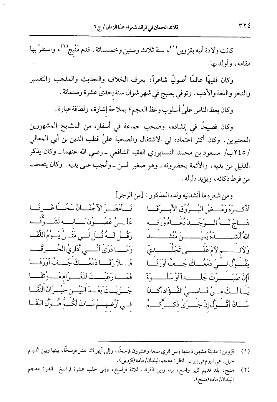 وكان فصيحًا في إنشاده، وصحب جماعة في أسفاره من المشايخ المشهورين المعتبرين. وكان أكثر اعتماده في الاشتغال والصحبة على قطب الدين بن أبي المعال/ 245 ب/ مسعود بن محمد النيسابوري الفقيه الشافعي- رضي الله عنهما- وكان يذكر الدليل من يديه، والأئمة يحضرونه- وهو صغير السن- وأنجب على يديه. وكان يتعجب من فرط ذكائه، ويؤيد دليله.