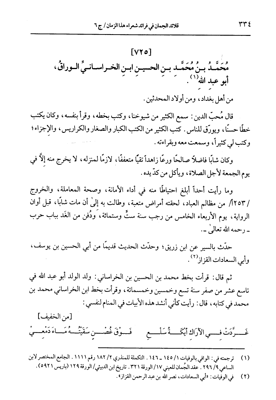 ثم قال: قرأت بخط محمد بن الحسين بن الخراساني: ولد الولد أبو عبد الله في تاسع عشر من صفر سنة تسع وخمسين وخمسمائة، وقرأت بخط ابن الخراساني محمد بن محمد في كتابه، قال: رأيت كأني أنشد هذه الأبيات في المنام لنفسي: