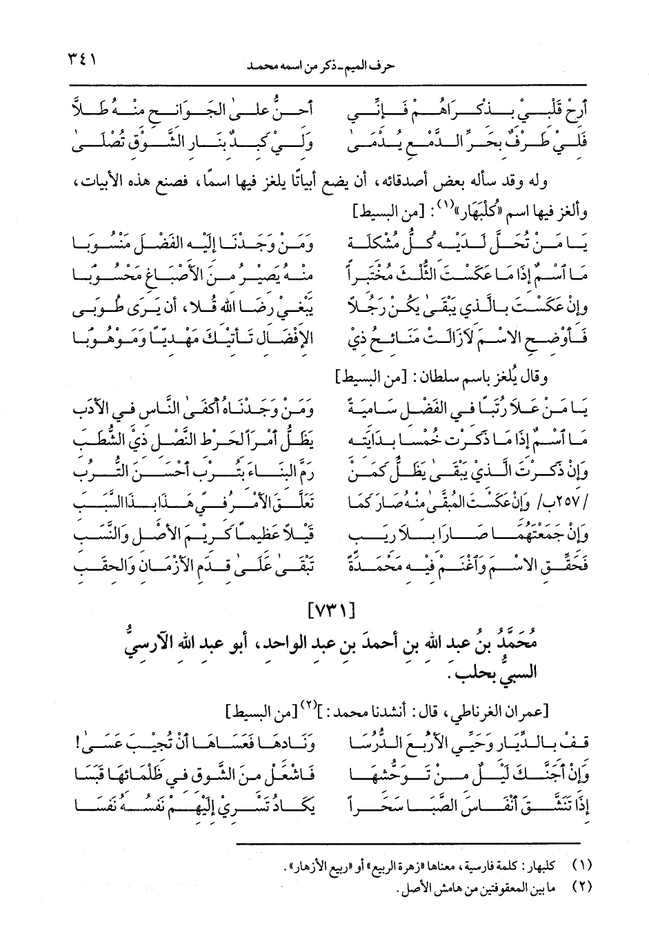 وله وقد سأله بعض أصدقائه، أن يضع أبياتًا يلغز فيها اسمًا، فصنع هذه الأبيات، وألغز فيها اسم ((كلبهار)): [من البسيط]