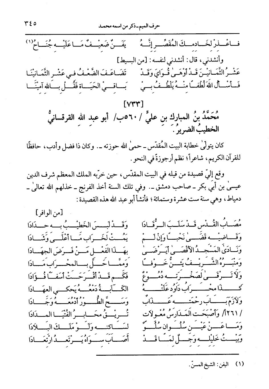 وقع إليّ قصيدة من قيله في البيت المقدّس، حين خرّبه الملك المعظم شرف الدين عيسى بن أبي بكر- صاحب دمشق-. وفي تلك السنة أخذ الفرنج- خذلهم الله تعالى- دمياط، وهي سنة ست عشرة وستمائة؛ فأنشأ أبو عبد الله هذه القصيدة: