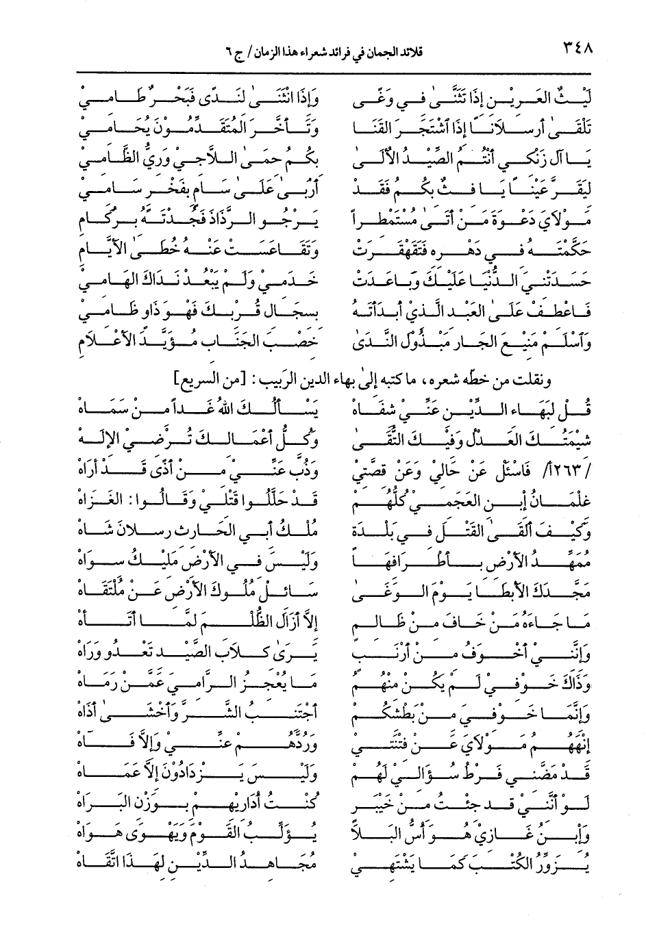 ونقلت من خطّه شعره، ما كتبه إلى بهاء الدين الربيب: [من السريع]
