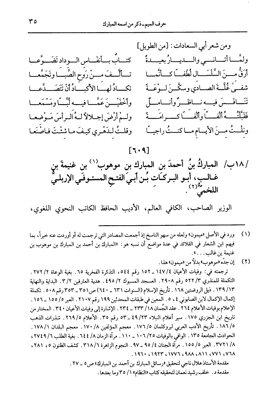 المبارك بن أحمد بن المبارك بن موهوب بن غنيمة ين غالب، أبو البركات بن أبي الفتح المستوفي الإربلي اللخميّ.