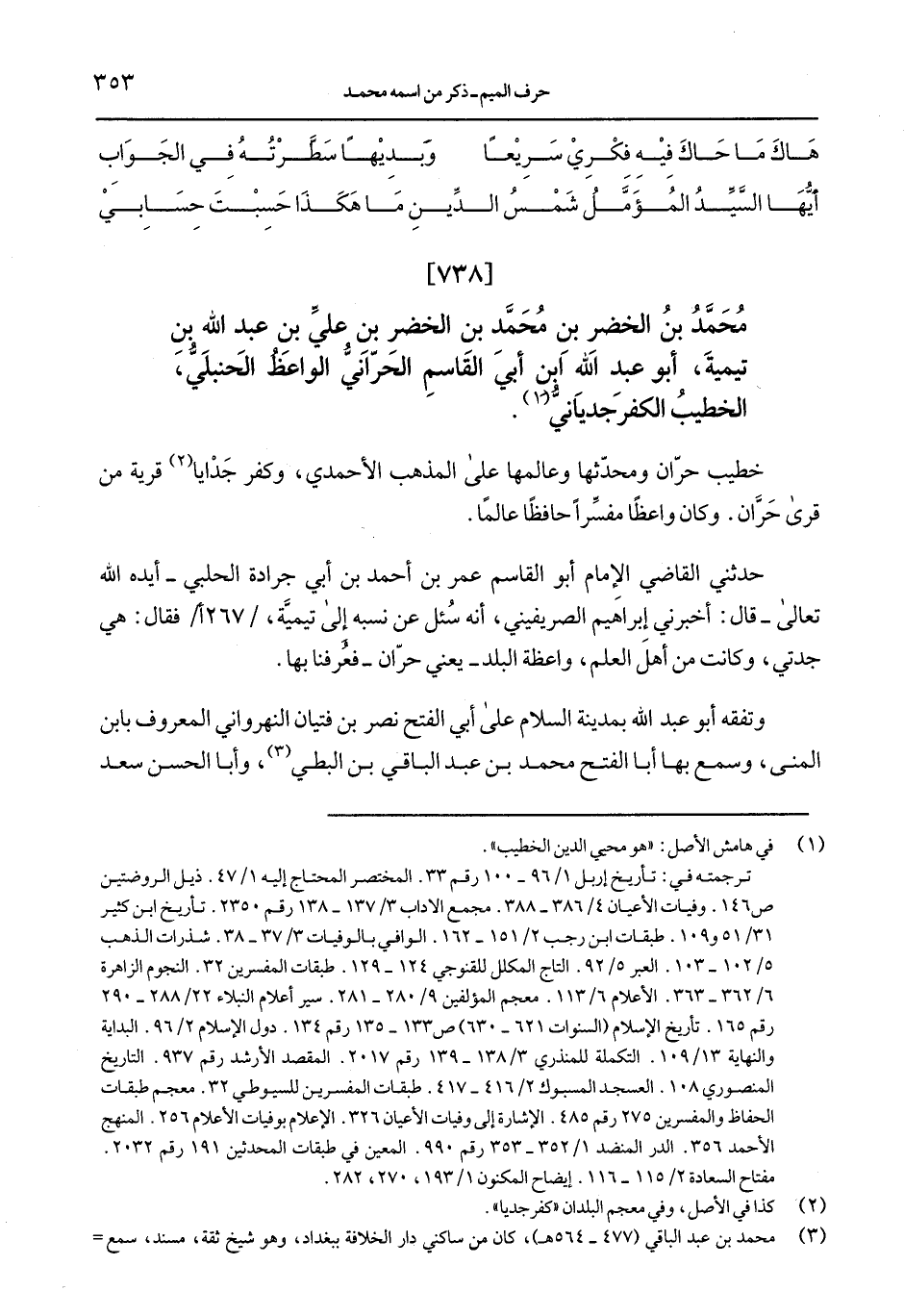 خطيب حرّان ومحدّثها وعالمها على المذهب الأحمدي، وكفر جدايا قرية من قرى حرَّان. وكان واعظًا مفسِّرًا حافظًا عالمًا.