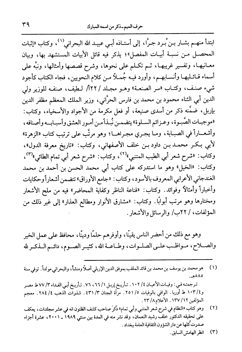 ابتدأ منهم بشار بن جرّا، إلي أستاذه أبس عبيد الله البحراني، وكتاب "إثبات المحصل من نسبة أبيات المفصل"؛ يذكر قائل الأبيات المستشهد بها، وبيان معانيها، وتفسير غريبها، ثم تكلم علي نحوها، وشرح قصصها وأمثالها، ونبّه علي أسماء قائليها وأنسابهم، وأورد فيه جملًا من كلام النحويين، فجاء الكتاب كأجود شئ صنف، وكتاب "سر الصنعة" وهو مجلد لطيف، صنفه للوزير ولي الدين أبي الثناء محمود بن فارس الحرّاني، وزير الملك المعظم مظفر الدين بإربل، ضمّنه ذكر من أسدي صنيعة، أو فعل مكرمة من الأجواد والأسخياء، وكتاب " موجات الصّبوة، وعزائم السلوة" يتضمن نبذًا من أمور العشق وأسبابه وأصنافه، وأشعارًا في الصبابة، وما يجري مجراها؛ وهو مرتّب علي ترتيب كتاب "الزهرة" لأبي بكر محمد بن داود بن خلف الأصفهاني، وكتاب: "تاريخ معرفة الدول"، وكتاب: "شرح شعر أبي الطيب المتنبي"، وكتاب: "شرح شعر أبي تمام الطائي"، وكتاب: "الخليل" وهو ما استدركه علي كتاب أبي محمد الحسن بن أحمد بن محمد الغندجاني الأعرابي المعروف بالأسود، وكتاب: "جامع الأوراق" تتضمن أشعارًا وحكايات وأخبارًا وأمثالًا وفوائد. وكتاب: "قناعة الناظر وكفاية المحاضر" فيه من ملمح الأشعار ومختارها وهو مرتب أبوابًا. وكتاب: "مشارق الأنوار ومطالع العذار" إلي غير ذلك من المؤلفات، والرسائل والأشعار.