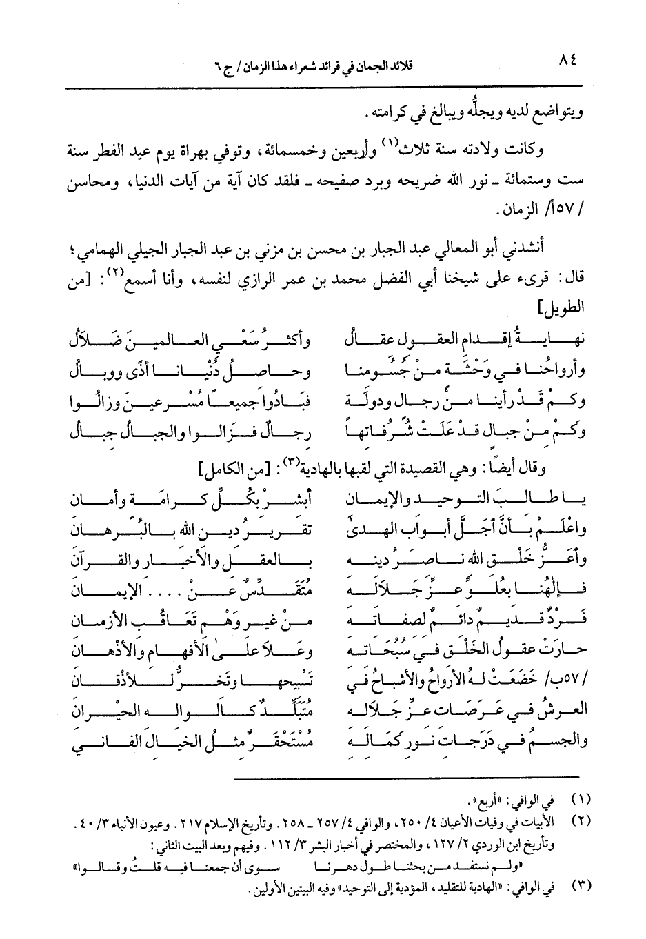 أنشدني أبو المعالي عبد الجبار بن محسن بن مزني بن عبد الجبار الجيلي الهمامي؛ قال: قرئ على شيخنا أبي الفضل محمد بن عر الرازي لنفسه، وأنا أسمع: [من الطويل]