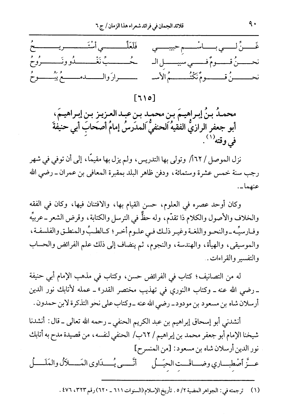 أنشدني أبو إسحاق إبراهيم بن عبد الكريم الحنفي- رحمه الله تعالى- قال: أنشدنا شيخنا الإمام أبو جعفر محمد بن إبراهيم الحنفي لنفسي، من قصيدة مدح به أتابك نور الدين أرسلان شاه بن مسعود: [من المنسرح]