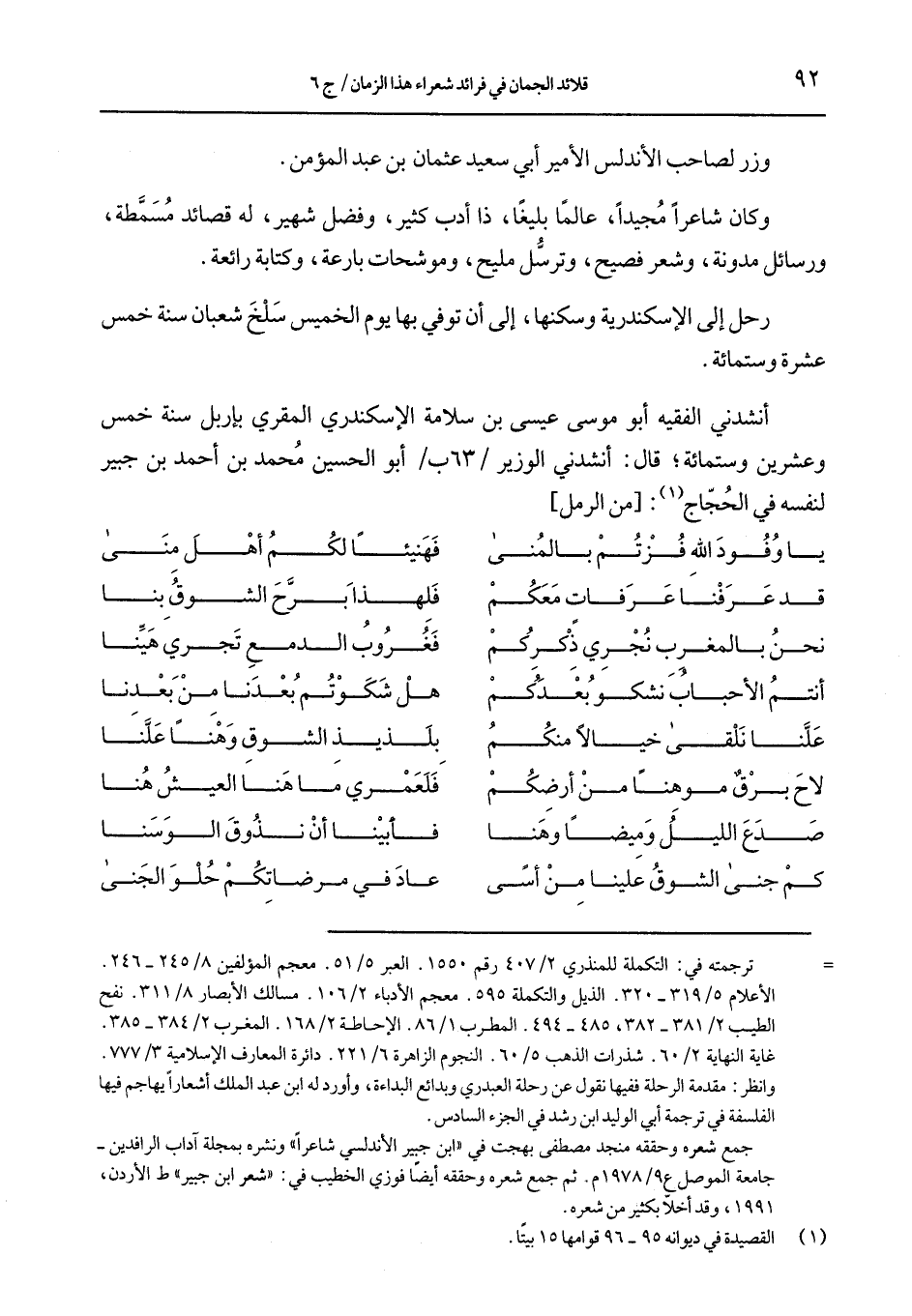وأنشدني الفقيه أبو موسى عيسى بن سلامة الإسكندري المقري باربل سنة خمس وعشرين وستمائة؛ قال: أنشدني الوزير أبو الحسين محمد بن أحمد بن جبير لنفسه في الحجاج: [من الرمل]