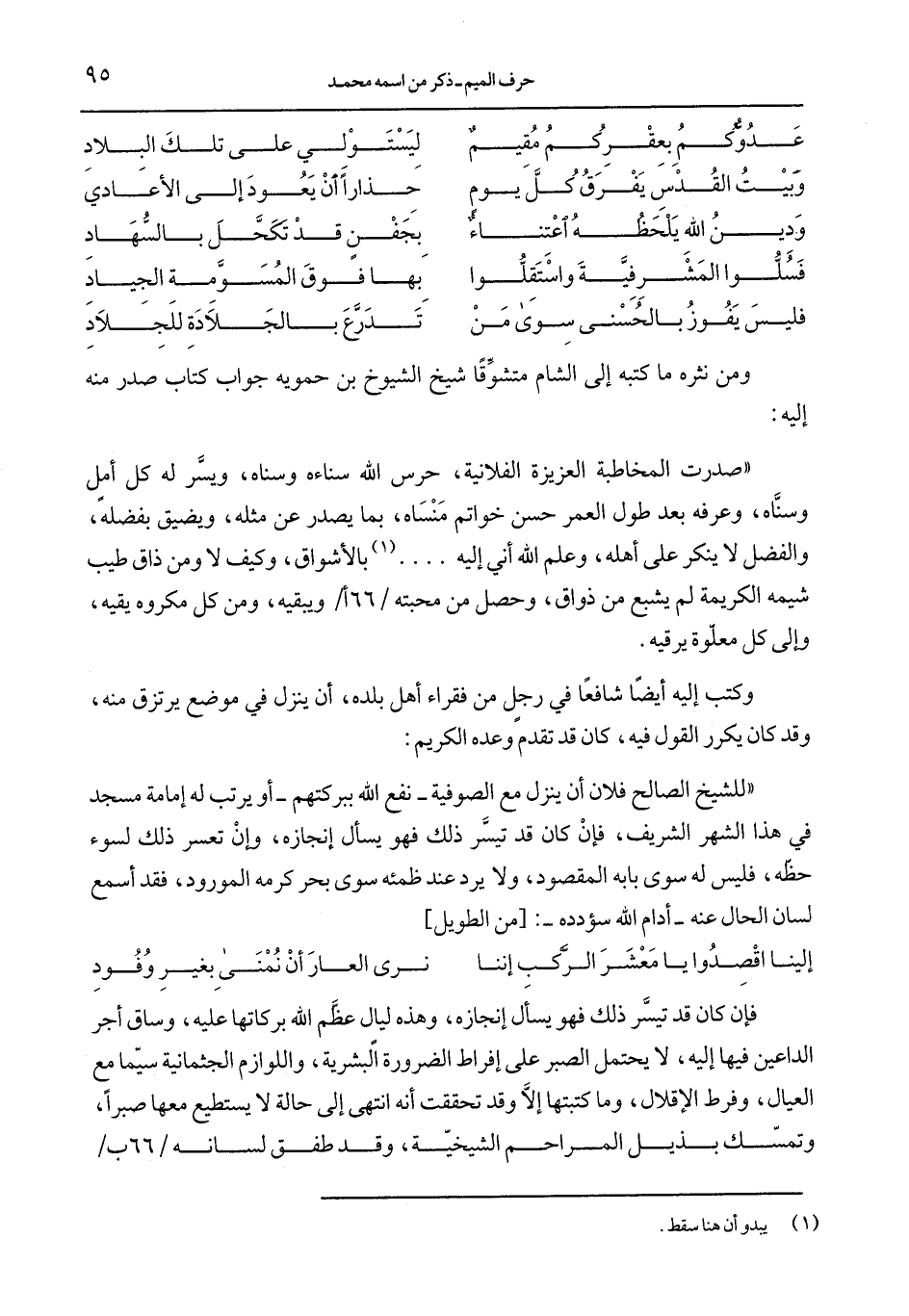 "لشيخ الصالح فلان أن ينزل مع الصوفية- نفع الله ببركتهم- أو يرتب له إمامة مسجد في هذا الشهر الشريف، فإذا كان قد تيسر ذلك فهو يسأل إنجازه، وإن تعسر ذلك لسوء حظه، فليس له سوى بابه المقصود، ولا يرد عند ظمئه سوى بحر كرمه المورود، فقد أسمع لسان الحال عنه- أدام الله سؤدده-[من الطويل]