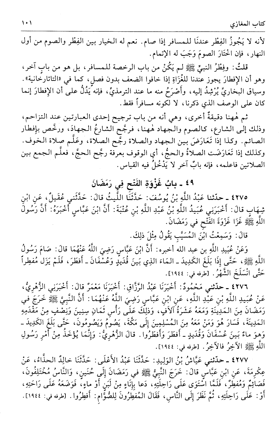 قلتُ: وفِطْرُ النبيِّ صلى الله عليه وسلّم لم يَكُنْ من باب الرخصة للمسافر، بل هو من بابٍ آخر، وهو أن الإِفطارَ يجوز عندنا للغُزَاةِ إذا خافوا الضعف بدون فصلٍ، كما في «التاتارخانية». وسياق البخاريِّ يُرْشِدُ إليه، وأَصْرَحُ منه ما عند الترمذيِّ، فإنه يَدُلُّ على أن الإِفطارَ إنما كان على الوصف الذي ذكرنا، لا لكونه مسافرًا فقط.