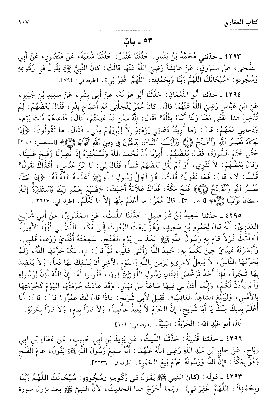 4293 - حَدَّثَنِى مُحَمَّدُ بْنُ بَشَّارٍ حَدَّثَنَا غُنْدَرٌ حَدَّثَنَا شُعْبَةُ عَنْ مَنْصُورٍ عَنْ أَبِى الضُّحَى عَنْ مَسْرُوقٍ عَنْ عَائِشَةَ - رضى الله عنها - قَالَتْ كَانَ النَّبِىُّ - صلى الله عليه وسلم - يَقُولُ فِى رُكُوعِهِ وَسُجُودِهِ «سُبْحَانَكَ اللَّهُمَّ، رَبَّنَا وَبِحَمْدِكَ، اللَّهُمَّ اغْفِرْ لِى». أطرافه 794، 817، 4967، 4968 - تحفة 17635