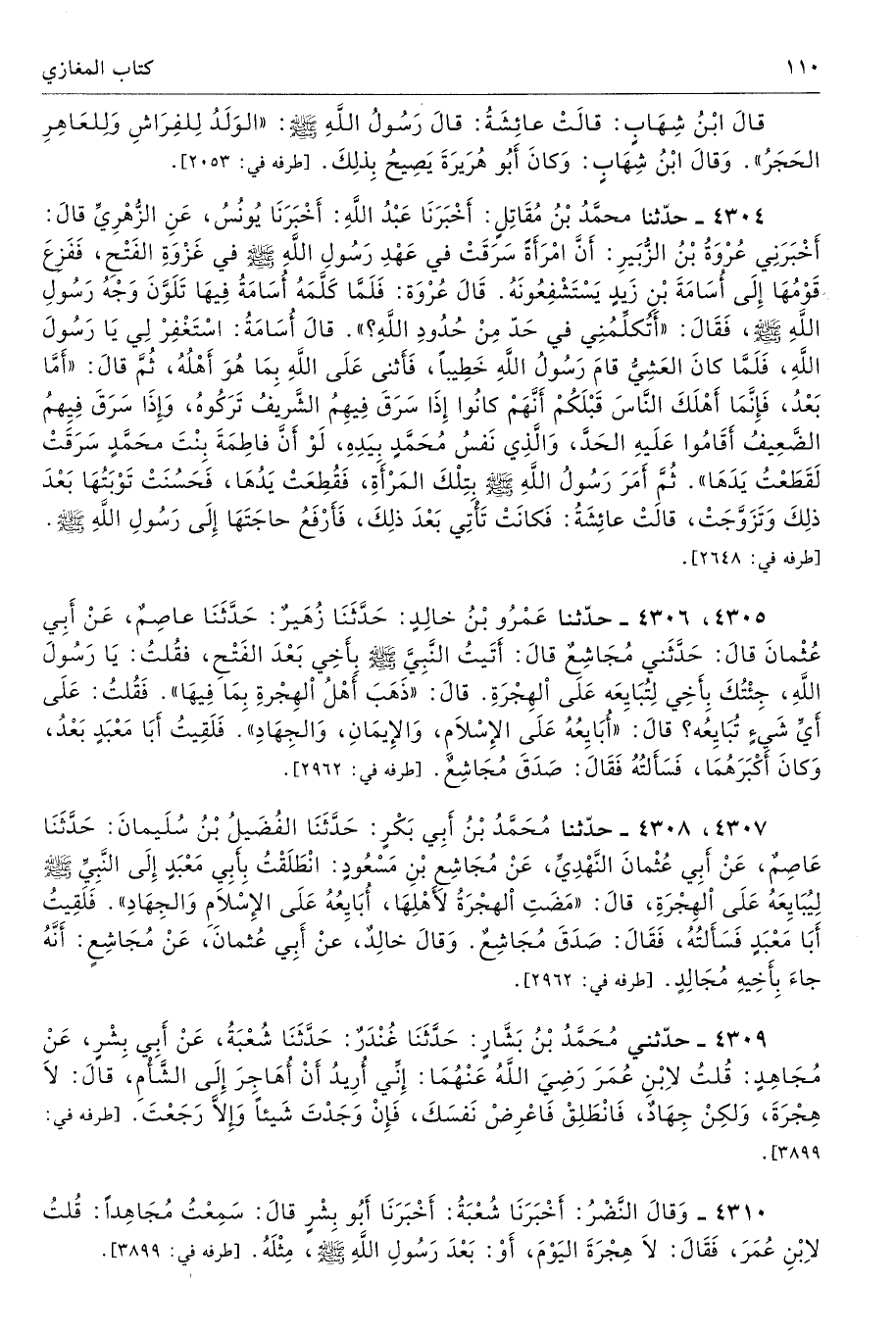 4307، 4308 - حَدَّثَنَا مُحَمَّدُ بْنُ أَبِى بَكْرٍ حَدَّثَنَا الْفُضَيْلُ بْنُ سُلَيْمَانَ حَدَّثَنَا عَاصِمٌ عَنْ أَبِى عُثْمَانَ النَّهْدِىِّ عَنْ مُجَاشِعِ بْنِ مَسْعُودٍ انْطَلَقْتُ بِأَبِى مَعْبَدٍ إِلَى النَّبِىِّ - صلى الله عليه وسلم - لِيُبَايِعَهُ عَلَى الْهِجْرَةِ، قَالَ «مَضَتِ الْهِجْرَةُ لأَهْلِهَا، أُبَايِعُهُ عَلَى الإِسْلاَمِ وَالْجِهَادِ». فَلَقِيتُ أَبَا مَعْبَدٍ فَسَأَلْتُهُ فَقَالَ صَدَقَ مُجَاشِعٌ. وَقَالَ خَالِدٌ عَنْ أَبِى عُثْمَانَ عَنْ مُجَاشِعٍ أَنَّهُ جَاءَ بِأَخِيهِ مُجَالِدٍ. [طرفه في: 2962].