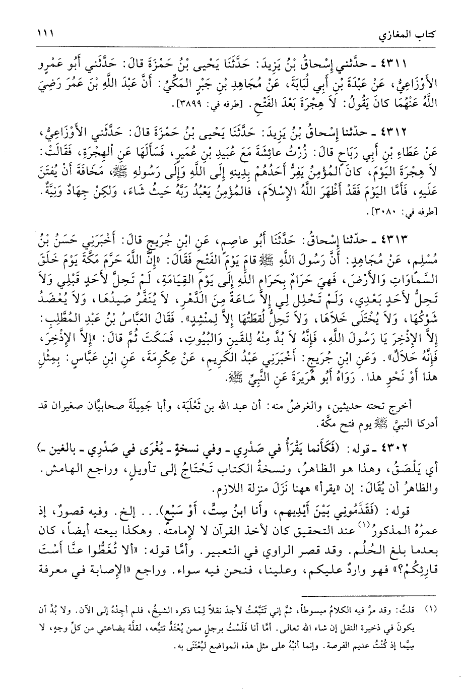 4311 - حَدَّثَنِى إِسْحَاقُ بْنُ يَزِيدَ حَدَّثَنَا يَحْيَى بْنُ حَمْزَةَ قَالَ حَدَّثَنِى أَبُو عَمْرٍو الأَوْزَاعِىُّ عَنْ عَبْدَةَ بْنِ أَبِى لُبَابَةَ عَنْ مُجَاهِدِ بْنِ جَبْرٍ الْمَكِّىِّ أَنَّ عَبْدَ اللَّهِ بْنَ عُمَرَ - رضى الله عنهما - كَانَ يَقُولُ لاَ هِجْرَةَ بَعْدَ الْفَتْحِ. أطرافه 3899، 4309، 4310 - تحفة 7392 أ