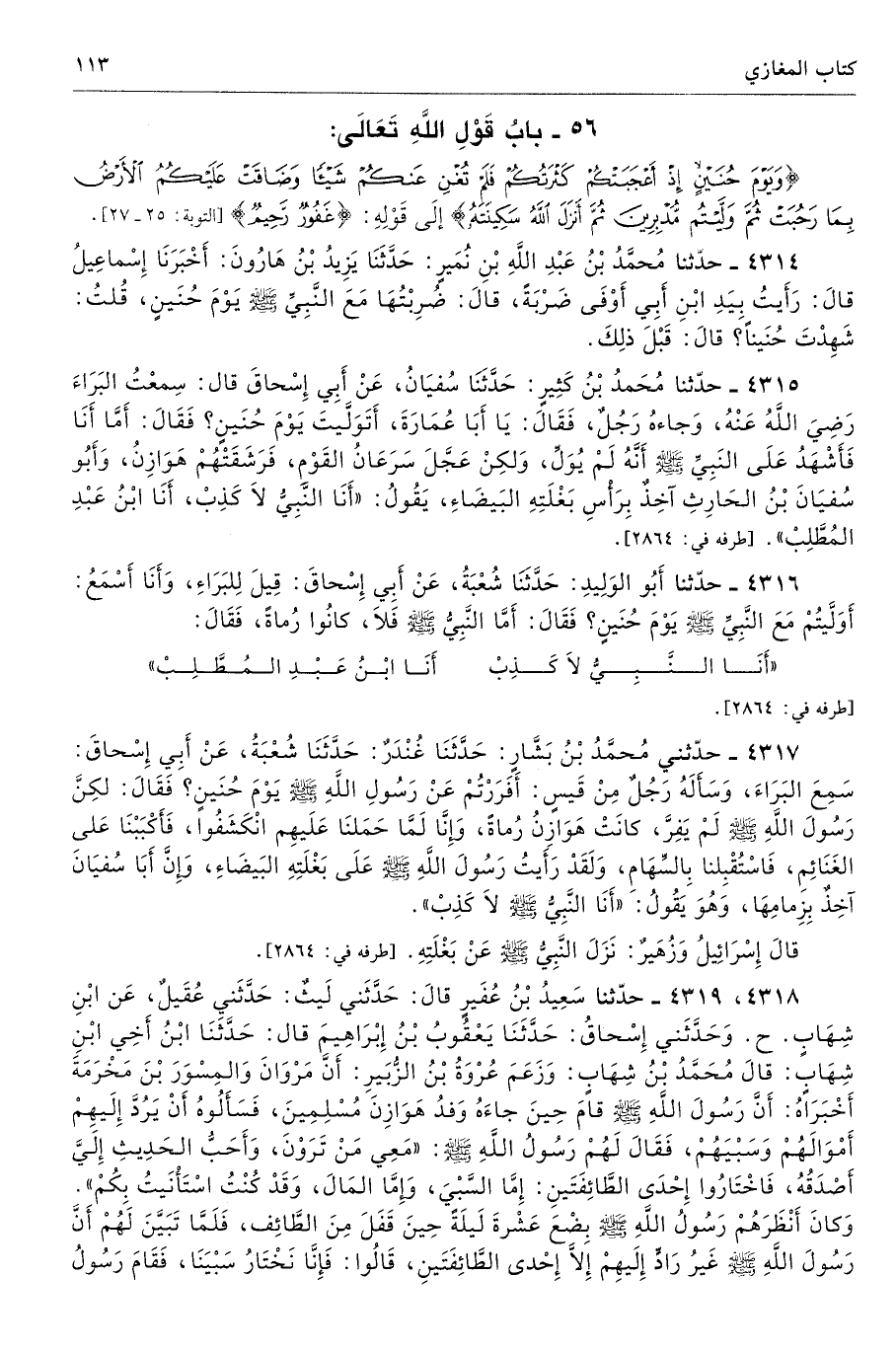 4315 - حَدَّثَنَا مُحَمَّدُ بْنُ كَثِيرٍ حَدَّثَنَا سُفْيَانُ عَنْ أَبِى إِسْحَاقَ قَالَ سَمِعْتُ الْبَرَاءَ رضى الله عنه وَجَاءَهُ رَجُلٌ فَقَالَ يَا أَبَا عُمَارَةَ أَتَوَلَّيْتَ يَوْمَ حُنَيْنٍ فَقَالَ أَمَّا أَنَا فَأَشْهَدُ عَلَى النَّبِىِّ - صلى الله عليه وسلم - أَنَّهُ لَمْ يُوَلِّ، وَلَكِنْ عَجِلَ سَرَعَانُ الْقَوْمِ، فَرَشَقَتْهُمْ هَوَازِنُ، وَأَبُو سُفْيَانَ بْنُ الْحَارِثِ آخِذٌ بِرَأْسِ بَغْلَتِهِ الْبَيْضَاءِ يَقُولُ «أَنَا النَّبِىُّ لاَ كَذِبْ، أَنَا ابْنُ عَبْدِ الْمُطَّلِبْ». أطرافه 2864، 2874، 2930، 3042، 4316، 4317 - تحفة 1848