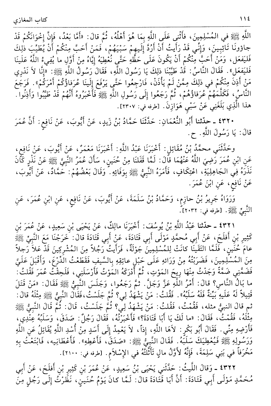 4322 - وَقَالَ اللَّيْثُ حَدَّثَنِى يَحْيَى بْنُ سَعِيدٍ عَنْ عُمَرَ بْنِ كَثِيرِ بْنِ أَفْلَحَ عَنْ أَبِى مُحَمَّدٍ مَوْلَى أَبِى قَتَادَةَ أَنَّ أَبَا قَتَادَةَ قَالَ لَمَّا كَانَ يَوْمُ حُنَيْنٍ نَظَرْتُ إِلَى رَجُلٍ مِنَ