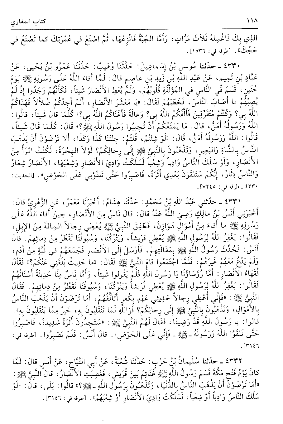 4332 - حَدَّثَنَا سُلَيْمَانُ بْنُ حَرْبٍ حَدَّثَنَا شُعْبَةُ عَنْ أَبِى التَّيَّاحِ عَنْ أَنَسٍ قَالَ لَمَّا كَانَ يَوْمَ فَتْحِ مَكَّةَ قَسَمَ رَسُولُ اللَّهِ - صلى الله عليه وسلم - غَنَائِمَ بَيْنَ قُرَيْشٍ. فَغَضِبَتِ الأَنْصَارُ قَالَ النَّبِىُّ - صلى الله عليه وسلم - «أَمَا تَرْضَوْنَ أَنْ يَذْهَبَ النَّاسُ بِالدُّنْيَا، وَتَذْهَبُونَ بِرَسُولِ اللَّهِ - صلى الله عليه وسلم -». قَالُوا بَلَى. قَالَ «لَوْ سَلَكَ النَّاسُ وَادِيًا أَوْ شِعْبًا لَسَلَكْتُ وَادِىَ الأَنْصَارِ أَوْ شِعْبَهُمْ». أطرافه 3146، 3147، 3528، 3778، 3793، 4331، 4333، 4334، 4337، 5860، 6762، 7441 - تحفة 1697