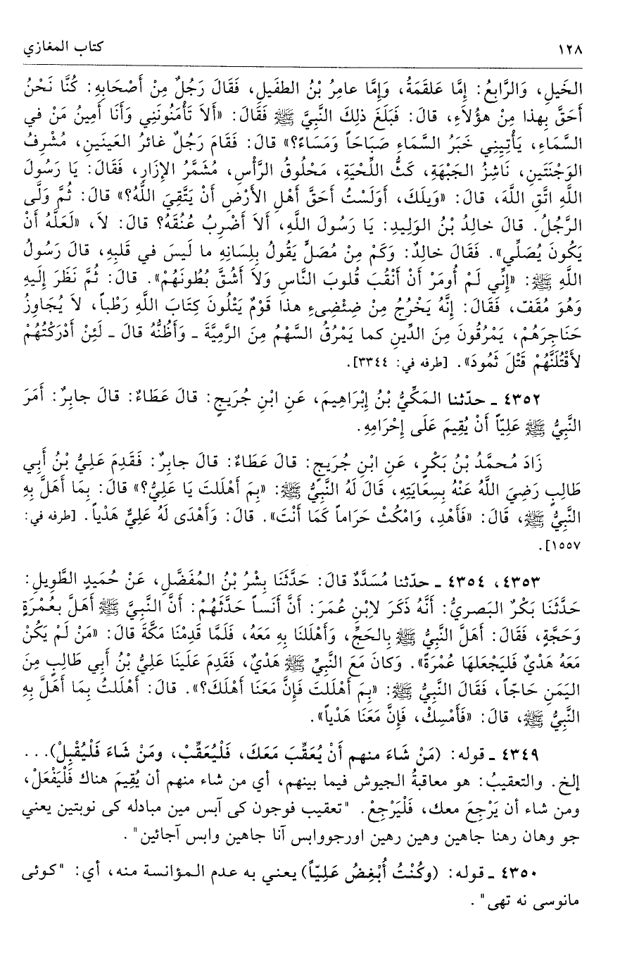 الْخَيْلِ، وَالرَّابِعُ إِمَّا عَلْقَمَةُ وَإِمَّا عَامِرُ بْنُ الطُّفَيْلِ، فَقَالَ رَجُلٌ مِنْ أَصْحَابِهِ كُنَّا نَحْنُ أَحَقَّ بِهَذَا مِنْ هَؤُلاَءِ. قَالَ فَبَلَغَ ذَلِكَ النَّبِىَّ - صلى الله عليه وسلم - فَقَالَ «أَلاَ تَأْمَنُونِى وَأَنَا أَمِينُ مَنْ فِى السَّمَاءِ، يَأْتِينِى خَبَرُ السَّمَاءِ صَبَاحًا وَمَسَاءً». قَالَ فَقَامَ رَجُلٌ غَائِرُ الْعَيْنَيْنِ، مُشْرِفُ الْوَجْنَتَيْنِ، نَاشِزُ الْجَبْهَةِ، كَثُّ اللِّحْيَةِ، مَحْلُوقُ الرَّأْسِ، مُشَمَّرُ الإِزَارِ، فَقَالَ يَا رَسُولَ اللَّهِ، اتَّقِ اللَّهَ. قَالَ «وَيْلَكَ أَوَلَسْتُ أَحَقَّ أَهْلِ الأَرْضِ أَنْ يَتَّقِىَ اللَّهَ». قَالَ ثُمَّ وَلَّى الرَّجُلُ، قَالَ خَالِدُ بْنُ الْوَلِيدِ يَا رَسُولَ اللَّهِ، أَلاَ أَضْرِبُ عُنُقَهُ قَالَ «لاَ، لَعَلَّهُ أَنْ يَكُونَ يُصَلِّى». فَقَالَ خَالِدٌ وَكَمْ مِنْ مُصَلٍّ يَقُولُ بِلِسَانِهِ مَا لَيْسَ فِى قَلْبِهِ. قَالَ رَسُولُ اللَّهِ - صلى الله عليه وسلم - «إِنِّى لَمْ أُومَرْ أَنْ أَنْقُبَ قُلُوبَ النَّاسِ، وَلاَ أَشُقَّ بُطُونَهُمْ» قَالَ ثُمَّ نَظَرَ إِلَيْهِ وَهْوَ مُقَفٍّ فَقَالَ «إِنَّهُ يَخْرُجُ مِنْ ضِئْضِئِ هَذَا قَوْمٌ يَتْلُونَ كِتَابَ اللَّهِ رَطْبًا، لاَ يُجَاوِزُ حَنَاجِرَهُمْ، يَمْرُقُونَ مِنَ الدِّينِ كَمَا يَمْرُقُ السَّهْمُ مِنَ الرَّمِيَّةِ». وَأَظُنُّهُ قَالَ «لَئِنْ أَدْرَكْتُهُمْ لأَقْتُلَنَّهُمْ قَتْلَ ثَمُودَ». أطرافه 3344، 3610، 4667، 5058، 6163، 6931، 6933، 7432، 7562 تحفة 4132 - 208/ 5