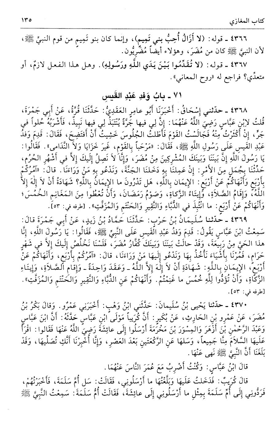 4369 - حَدَّثَنَا سُلَيْمَانُ بْنُ حَرْبٍ حَدَّثَنَا حَمَّادُ بْنُ زَيْدٍ عَنْ أَبِى جَمْرَةَ قَالَ سَمِعْتُ ابْنَ عَبَّاسٍ يَقُولُ قَدِمَ وَفْدُ عَبْدِ الْقَيْسِ عَلَى النَّبِىِّ - صلى الله عليه وسلم - فَقَالُوا يَا رَسُولَ اللَّهِ إِنَّا هَذَا الْحَىَّ مِنْ رَبِيعَةَ، وَقَدْ حَالَتْ بَيْنَنَا وَبَيْنَكَ كُفَّارُ مُضَرَ، فَلَسْنَا نَخْلُصُ إِلَيْكَ إِلاَّ فِى شَهْرٍ حَرَامٍ، فَمُرْنَا بِأَشْيَاءَ نَأْخُذُ بِهَا وَنَدْعُو إِلَيْهَا مَنْ وَرَاءَنَا. قَالَ «آمُرُكُمْ بِأَرْبَعٍ وَأَنْهَاكُمْ عَنْ أَرْبَعٍ، الإِيمَانِ بِاللَّهِ شَهَادَةِ أَنْ لاَ إِلَهَ إِلاَّ اللَّهُ - وَعَقَدَ وَاحِدَةً - وَإِقَامِ الصَّلاَةِ، وَإِيتَاءِ الزَّكَاةِ، وَأَنْ تُؤَدُّوا لِلَّهِ خُمْسَ مَا غَنِمْتُمْ، وَأَنْهَاكُمْ عَنِ الدُّبَّاءِ، وَالنَّقِيرِ وَالْحَنْتَمِ وَالْمُزَفَّتِ». أطرافه 53، 87، 523، 1398، 3095، 3510، 4368، 6176، 7266، 7556 تحفة 6524 - 214/ 5