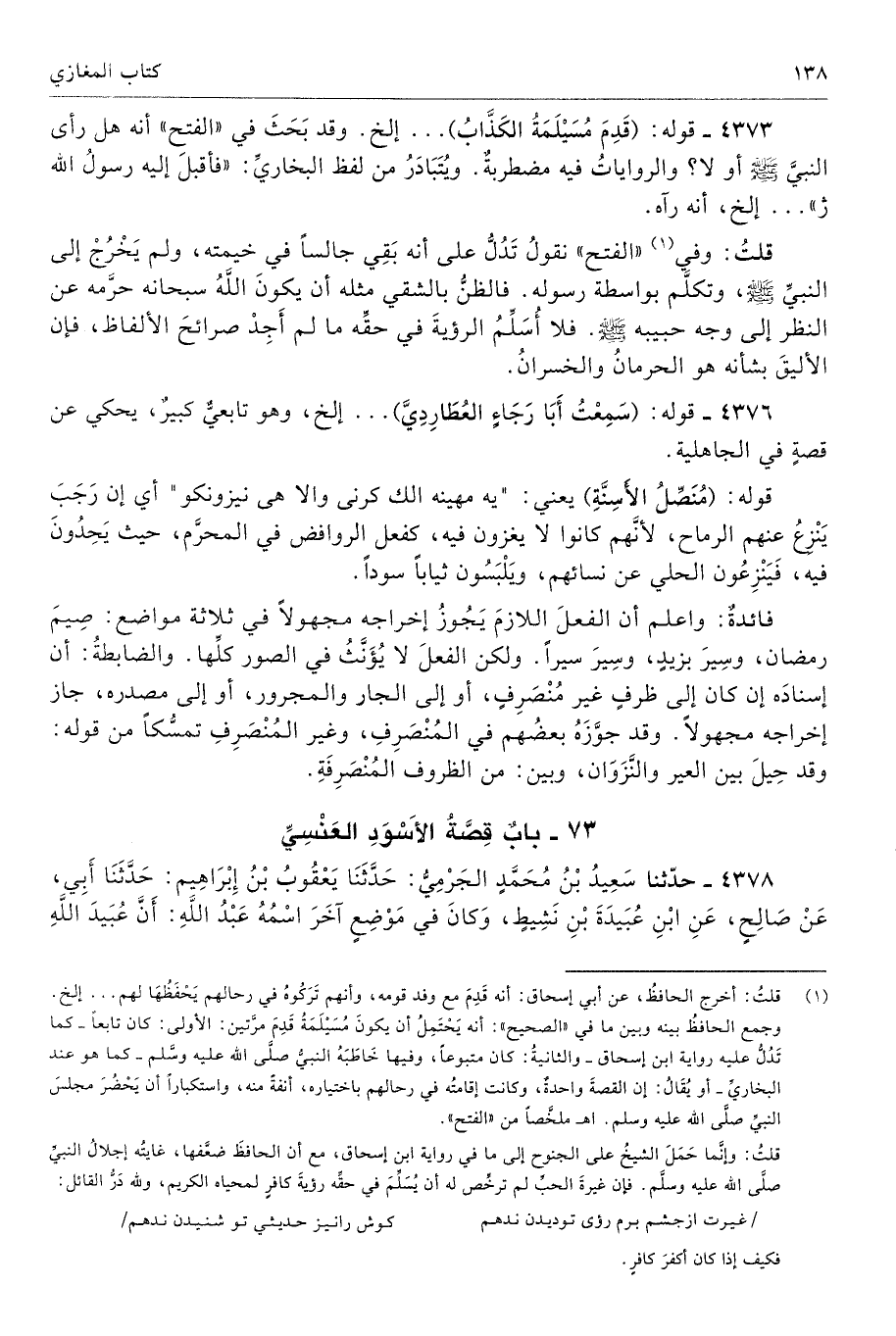 4373 - قوله: (قَدِمَ مُسَيْلَمَةُ الكَذَّابُ) ... إلخ. وقد بَحَثَ في «الفتح» أنه هل رأى النبيَّ صلى الله عليه وسلّم أو لا؟ والرواياتُ فيه مضطربةٌ. ويُتَبَادَرُ من لفظ البخاريِّ: «فأقبلَ إليه رسولُ الله صلى الله عليه وسلّم» ... إلخ، أنه رآه.