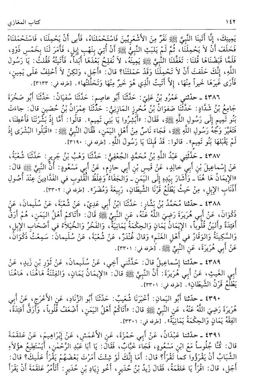4388 - حَدَّثَنَا مُحَمَّدُ بْنُ بَشَّارٍ حَدَّثَنَا ابْنُ أَبِى عَدِىٍّ عَنْ شُعْبَةَ عَنْ سُلَيْمَانَ عَنْ ذَكْوَانَ عَنْ أَبِى هُرَيْرَةَ - رضى الله عنه - عَنِ النَّبِىِّ - صلى الله عليه وسلم - قَالَ «أَتَاكُمْ أَهْلُ الْيَمَنِ، هُمْ أَرَقُّ أَفْئِدَةً وَأَلْيَنُ قُلُوبًا، الإِيمَانُ يَمَانٍ وَالْحِكْمَةُ يَمَانِيَةٌ، وَالْفَخْرُ وَالْخُيَلاَءُ فِى أَصْحَابِ الإِبِلِ، وَالسَّكِينَةُ وَالْوَقَارُ فِى أَهْلِ الْغَنَمِ». وَقَالَ غُنْدَرٌ عَنْ شُعْبَةَ عَنْ سُلَيْمَانَ سَمِعْتُ ذَكْوَانَ عَنْ أَبِى هُرَيْرَةَ عَنِ النَّبِىِّ - صلى الله عليه وسلم -. أطرافه 3301، 3499، 4389، 4390 - تحفة 12396