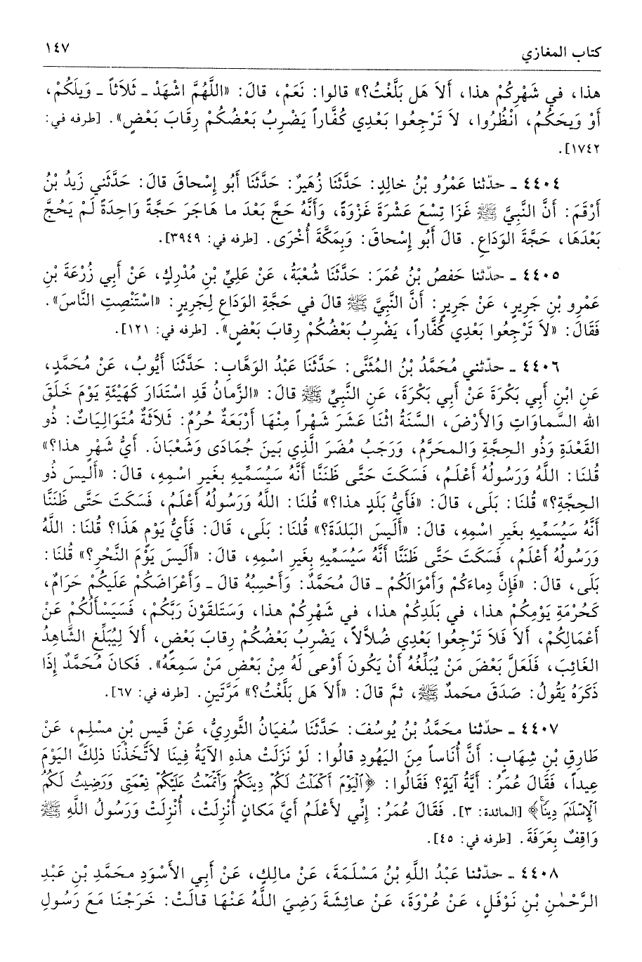 4405 - حَدَّثَنَا حَفْصُ بْنُ عُمَرَ حَدَّثَنَا شُعْبَةُ عَنْ عَلِىِّ بْنِ مُدْرِكٍ عَنْ أَبِى زُرْعَةَ بْنِ عَمْرِو بْنِ جَرِيرٍ عَنْ جَرِيرٍ أَنَّ النَّبِىَّ - صلى الله عليه وسلم - قَالَ فِى حَجَّةِ الْوَدَاعِ لِجَرِيرٍ «اسْتَنْصِتِ النَّاسَ» فَقَالَ «لاَ تَرْجِعُوا بَعْدِى كُفَّارًا، يَضْرِبُ بَعْضُكُمْ رِقَابَ بَعْضٍ». أطرافه 121، 6869، 7080 - تحفة 3236