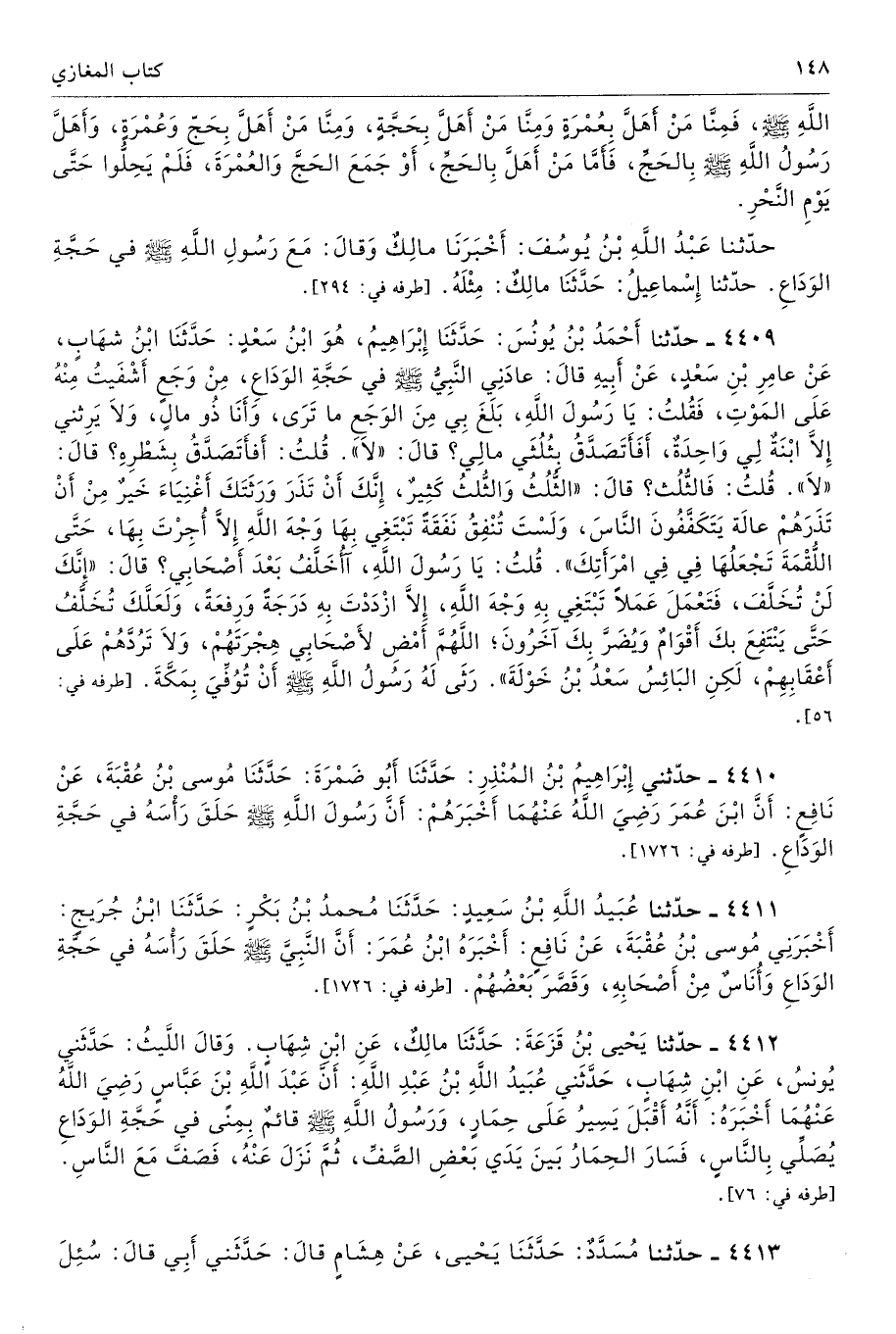 حَدَّثَنَا عَبْدُ اللَّهِ بْنُ يُوسُفَ أَخْبَرَنَا مَالِكٌ وَقَالَ مَعَ رَسُولِ اللَّهِ - صلى الله عليه وسلم - فِى حَجَّةِ الْوَدَاعِ. حَدَّثَنَا إِسْمَاعِيلُ حَدَّثَنَا مَالِكٌ مِثْلَهُ. أطرافه 294، 305، 316، 317، 319، 328، 1516، 1518، 1556، 1560، 1561، 1562، 1638، 1650، 1709، 1720، 1733، 1757، 1762، 1771، 1772، 1783، 1786، 1787، 1788، 2952، 2984، 4395، 4401، 5329، 5548، 5559، 6157، 7229 - تحفة 16389