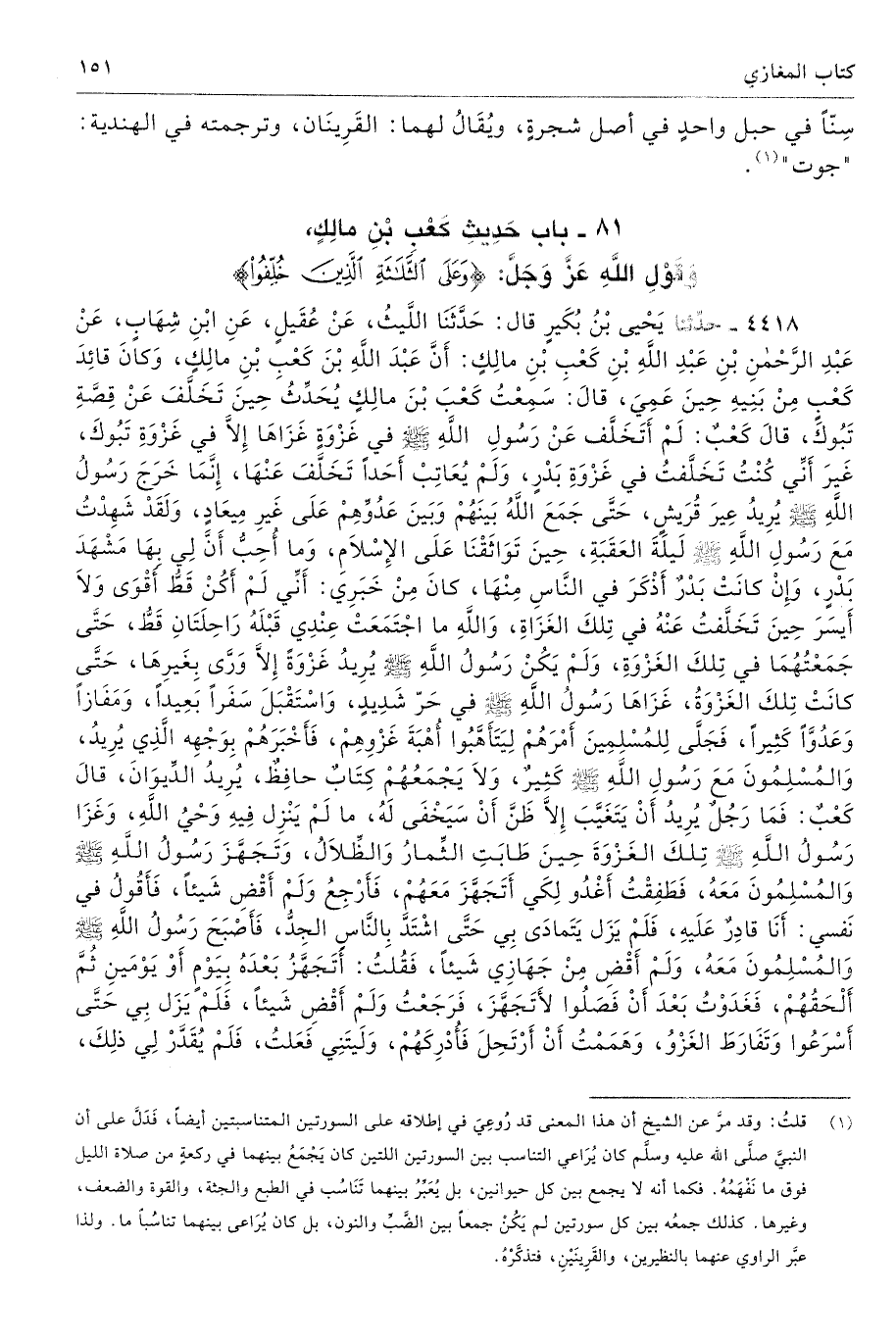 81 - باب حَدِيثُ كَعْبِ بْنِ مَالِكٍ، وَقَوْلُ اللَّهِ عَزَّ وَجَلَّ: {وَعَلَى الثَّلَاثَةِ الَّذِينَ خُلِّفُوا}