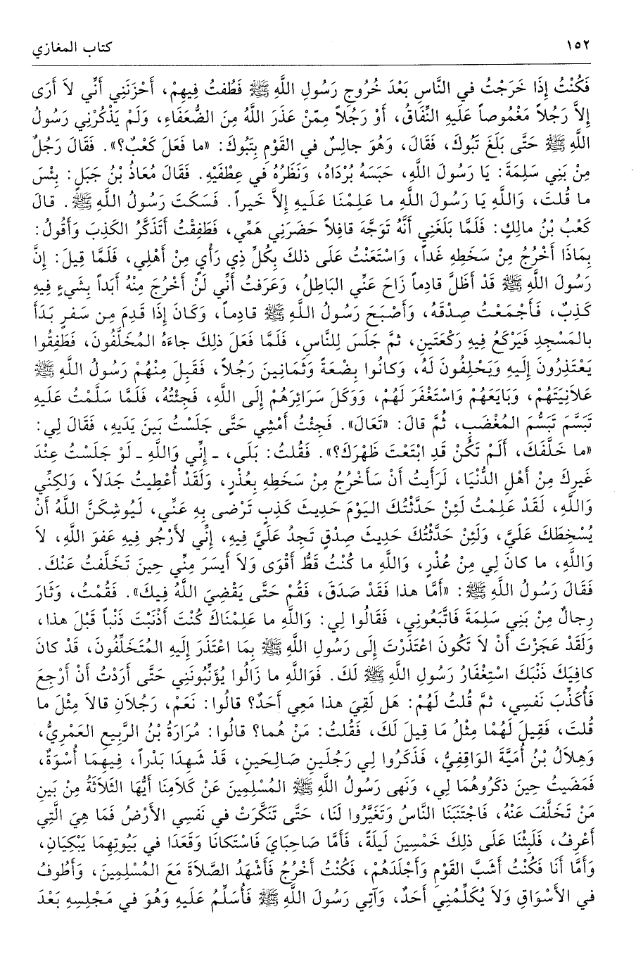فَكُنْتُ إِذَا خَرَجْتُ فِى النَّاسِ بَعْدَ خُرُوجِ رَسُولِ اللَّهِ - صلى الله عليه وسلم - فَطُفْتُ فِيهِمْ، أَحْزَنَنِى أَنِّى لاَ أَرَى إِلاَّ رَجُلاً مَغْمُوصًا عَلَيْهِ النِّفَاقُ أَوْ رَجُلاً مِمَّنْ عَذَرَ اللَّهُ مِنَ الضُّعَفَاءِ، وَلَمْ يَذْكُرْنِى رَسُولُ اللَّهِ - صلى الله عليه وسلم - حَتَّى بَلَغَ تَبُوكَ، فَقَالَ وَهْوَ جَالِسٌ فِى الْقَوْمِ بِتَبُوكَ «مَا فَعَلَ كَعْبٌ». فَقَالَ رَجُلٌ مِنْ بَنِى سَلِمَةَ يَا رَسُولَ اللَّهِ، حَبَسَهُ بُرْدَاهُ وَنَظَرُهُ فِى عِطْفِهِ. فَقَالَ مُعَاذُ بْنُ جَبَلٍ بِئْسَ مَا قُلْتَ، وَاللَّهِ يَا رَسُولَ اللَّهِ، مَا عَلِمْنَا عَلَيْهِ إِلاَّ خَيْرًا. فَسَكَتَ رَسُولُ اللَّهِ - صلى الله عليه وسلم -. قَالَ كَعْبُ بْنُ مَالِكٍ فَلَمَّا بَلَغَنِى أَنَّهُ تَوَجَّهَ قَافِلاً حَضَرَنِى هَمِّى، وَطَفِقْتُ أَتَذَكَّرُ الْكَذِبَ وَأَقُولُ بِمَاذَا أَخْرُجُ مِنْ سَخَطِهِ غَدًا وَاسْتَعَنْتُ عَلَى ذَلِكَ بِكُلِّ ذِى رَأْىٍ مِنْ أَهْلِى، فَلَمَّا قِيلَ إِنَّ رَسُولَ اللَّهِ - صلى الله عليه وسلم - قَدْ أَظَلَّ قَادِمًا زَاحَ عَنِّى الْبَاطِلُ، وَعَرَفْتُ أَنِّى لَنْ أَخْرُجَ مِنْهُ أَبَدًا بِشَىْءٍ فِيهِ كَذِبٌ، فَأَجْمَعْتُ صِدْقَهُ، وَأَصْبَحَ رَسُولُ اللَّهِ - صلى الله عليه وسلم - قَادِمًا، وَكَانَ إِذَا قَدِمَ مِنْ سَفَرٍ بَدَأَ بِالْمَسْجِدِ فَيَرْكَعُ فِيهِ رَكْعَتَيْنِ ثُمَّ جَلَسَ لِلنَّاسِ، فَلَمَّا فَعَلَ ذَلِكَ جَاءَهُ الْمُخَلَّفُونَ، فَطَفِقُوا يَعْتَذِرُونَ إِلَيْهِ، وَيَحْلِفُونَ لَهُ، وَكَانُوا بِضْعَةً وَثَمَانِينَ رَجُلاً فَقَبِلَ مِنْهُمْ رَسُولُ اللَّهِ - صلى الله عليه وسلم - عَلاَنِيَتَهُمْ، وَبَايَعَهُمْ وَاسْتَغْفَرَ لَهُمْ، وَوَكَلَ سَرَائِرَهُمْ إِلَى اللَّهِ، فَجِئْتُهُ فَلَمَّا سَلَّمْتُ عَلَيْهِ تَبَسَّمَ تَبَسُّمَ الْمُغْضَبِ، ثُمَّ قَالَ «تَعَالَ». فَجِئْتُ أَمْشِى حَتَّى جَلَسْتُ بَيْنَ يَدَيْهِ، فَقَالَ لِى «مَا خَلَّفَكَ أَلَمْ تَكُنْ قَدِ ابْتَعْتَ ظَهْرَكَ». فَقُلْتُ بَلَى، إِنِّى وَاللَّهِ لَوْ جَلَسْتُ عِنْدَ غَيْرِكَ مِنْ أَهْلِ الدُّنْيَا، لَرَأَيْتُ أَنْ سَأَخْرُجُ مِنْ سَخَطِهِ بِعُذْرٍ، وَلَقَدْ أُعْطِيتُ جَدَلاً، وَلَكِنِّى وَاللَّهِ لَقَدْ عَلِمْتُ لَئِنْ حَدَّثْتُكَ الْيَوْمَ حَدِيثَ كَذِبٍ تَرْضَى بِهِ عَنِّى لَيُوشِكَنَّ اللَّهُ أَنْ يُسْخِطَكَ عَلَىَّ، وَلَئِنْ حَدَّثْتُكَ حَدِيثَ صِدْقٍ تَجِدُ عَلَىَّ فِيهِ إِنِّى لأَرْجُو فِيهِ عَفْوَ اللَّهِ، لاَ وَاللَّهِ مَا كَانَ لِى مِنْ عُذْرٍ، وَاللَّهِ مَا كُنْتُ قَطُّ أَقْوَى وَلاَ أَيْسَرَ مِنِّى حِينَ تَخَلَّفْتُ عَنْكَ. فَقَالَ رَسُولُ اللَّهِ - صلى الله عليه وسلم - «أَمَّا هَذَا فَقَدْ صَدَقَ، فَقُمْ حَتَّى يَقْضِىَ اللَّهُ فِيكَ». فَقُمْتُ وَثَارَ رِجَالٌ مِنْ بَنِى سَلِمَةَ فَاتَّبَعُونِى، فَقَالُوا لِى وَاللَّهِ مَا عَلِمْنَاكَ كُنْتَ أَذْنَبْتَ ذَنْبًا قَبْلَ هَذَا، وَلَقَدْ عَجَزْتَ أَنْ لاَ تَكُونَ اعْتَذَرْتَ إِلَى رَسُولِ اللَّهِ - صلى الله عليه وسلم - بِمَا اعْتَذَرَ إِلَيْهِ الْمُتَخَلِّفُونَ، قَدْ كَانَ كَافِيَكَ ذَنْبَكَ اسْتِغْفَارُ رَسُولِ اللَّهِ - صلى الله عليه وسلم - لَكَ، فَوَاللَّهِ مَا زَالُوا يُؤَنِّبُونِى حَتَّى أَرَدْتُ أَنْ أَرْجِعَ فَأُكَذِّبُ نَفْسِى، ثُمَّ قُلْتُ لَهُمْ هَلْ لَقِىَ هَذَا مَعِى أَحَدٌ قَالُوا نَعَمْ، رَجُلاَنِ قَالاَ مِثْلَ مَا قُلْتَ، فَقِيلَ لَهُمَا مِثْلُ مَا قِيلَ لَكَ. فَقُلْتُ مَنْ هُمَا قَالُوا مُرَارَةُ بْنُ الرَّبِيعِ الْعَمْرِىُّ وَهِلاَلُ بْنُ أُمَيَّةَ الْوَاقِفِىُّ. فَذَكَرُوا لِى رَجُلَيْنِ صَالِحَيْنِ قَدْ شَهِدَا بَدْرًا فِيهِمَا إِسْوَةٌ، فَمَضَيْتُ حِينَ ذَكَرُوهُمَا لِى، وَنَه