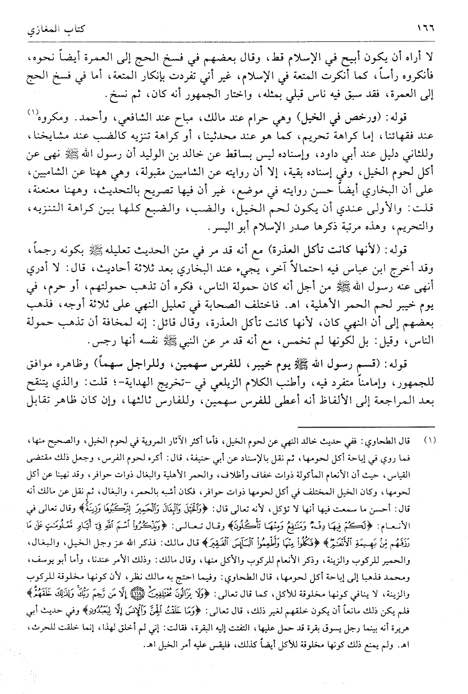 (¬1) قال الطحاوي: ففي حديث خالد النهي عن لحوم الخيل، فأما أكثر الآثار المروية في لحوم الخيل، والصحيح منها، فما روي في إباحة أكل لحومها، ثم نقل بالإسناد عن أبي حنيفة، قال: أكره لحوم الفرس، وجعل ذلك مقتضى القياس، حيث أن الأنعام المأكولة ذوات خفاف وأظلاف، والحمر الأهلية والبغال ذوات حوافر، وقد نهينا عن أكل لحومها، وكان الخيل المختلف في أكل لحومها ذوات حوافر، فكان أشبه بالحمر، والبغال، ثم نقل عن مالك أنه قال: أحسن ما سمعت فيها أنها لا تؤكل، لأنه تعالى قال: {وَالْخَيْلَ وَالْبِغَالَ وَالْحَمِيرَ لِتَرْكَبُوهَا وَزِينَةً} وقال تعالى في الأنعام: {وَالْأَنْعَامَ خَلَقَهَا لَكُمْ فِيهَا دِفْءٌ وَمَنَافِعُ وَمِنْهَا تَأْكُلُونَ} وقال تعالى: {وَيَذْكُرُوا اسْمَ اللَّهِ فِي أَيَّامٍ مَعْلُومَاتٍ عَلَى مَا رَزَقَهُمْ مِنْ بَهِيمَةِ الْأَنْعَامِ} {فَكُلُوا مِنْهَا وَأَطْعِمُوا الْبَائِسَ الْفَقِيرَ} قال مالك: فذكر الله عز وجل الخيل، والبغال، والحمير للركوب والزينة، وذكر الأنعام للركوب والأكل منها، وقال مالك: وذلك الأمر عندنا، وأما أبو يوسف، ومحمد فذهبا إلى إباحة أكل لحومها، قال الطحاوي: وفيما احتج به مالك نظر، لأن كونها مخلوقة للركوب والزينة، لا ينافي كونها مخلوقة للأكل، كما قال تعالى: {وَلَا يَزَالُونَ مُخْتَلِفِينَ (118) إِلَّا مَنْ رَحِمَ رَبُّكَ وَلِذَلِكَ خَلَقَهُمْ} فلم يكن ذلك مانعًا أن يكون خلقهم لغير ذلك، قال تعالى: {وَمَا خَلَقْتُ الْجِنَّ وَالْإِنْسَ إِلَّا لِيَعْبُدُونِ} وفي حديث أبي هريرة أنه بينما رجل يسوق بقرة قد حمل عليها، التفتت إليه البقرة، فقالت: إني لم أخلق لهذا، إنما خلقت للحرث، اهـ. ولم يمنع ذلك كونها مخلوقة للأكل أيضًا كذلك، فليقس عليه أمر الخيل اهـ.