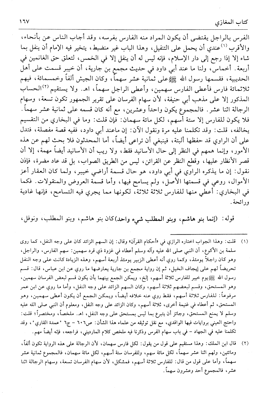 (¬2) قال ابن الملك: وهذا مستقيم على قول من يقول: لكل فارس سهمان، لأن الرجالة على هذه الرواية تكون ألفًا، ومائتين، ولهم اثنا عشر سهمًا، لكل مائة سهم، وللفرسان ستة أسهم، لكل مائة سهمان، فالمجموع ثمانية عشر سهمًا، وأما على قول من قال: للفارس ثلاثة أسهم، فمشكل، لأن سهام الفرسان تسعة، وسهام الرجالة اثنا عشر، فالمجموع أحد وعشرون سهمًا.