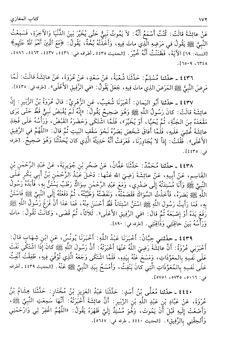 4436 - حَدَّثَنَا مُسْلِمٌ حَدَّثَنَا شُعْبَةُ عَنْ سَعْدٍ عَنْ عُرْوَةَ عَنْ عَائِشَةَ قَالَتْ لَمَّا مَرِضَ النَّبِىُّ - صلى الله عليه وسلم - الْمَرَضَ الَّذِى مَاتَ فِيهِ جَعَلَ يَقُولُ «فِى الرَّفِيقِ الأَعْلَى». أطرافه 4435، 4437، 4463، 4586، 6348، 6509 - تحفة 16338
