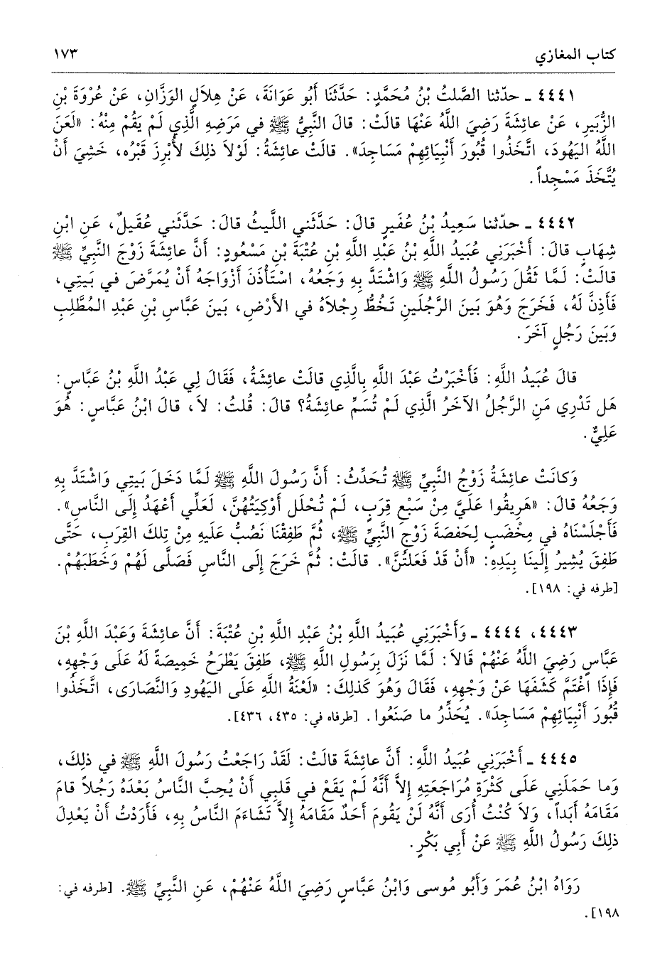 4441 - حَدَّثَنَا الصَّلْتُ بْنُ مُحَمَّدٍ حَدَّثَنَا أَبُو عَوَانَةَ عَنْ هِلاَلٍ الْوَزَّانِ عَنْ عُرْوَةَ بْنِ الزُّبَيْرِ عَنْ عَائِشَةَ - رضى الله عنها - قَالَتْ قَالَ النَّبِىُّ - صلى الله عليه وسلم - فِى مَرَضِهِ الَّذِى لَمْ يَقُمْ مِنْهُ «لَعَنَ اللَّهُ الْيَهُودَ، اتَّخَذُوا قُبُورَ أَنْبِيَائِهِمْ مَسَاجِدَ». قَالَتْ عَائِشَةُ لَوْلاَ ذَلِكَ لأُبْرِزَ قَبْرُهُ. خَشِىَ أَنْ يُتَّخَذَ مَسْجِدًا. أطرافه 435، 1330، 1390، 3453، 4443، 5815 - تحفة 17346