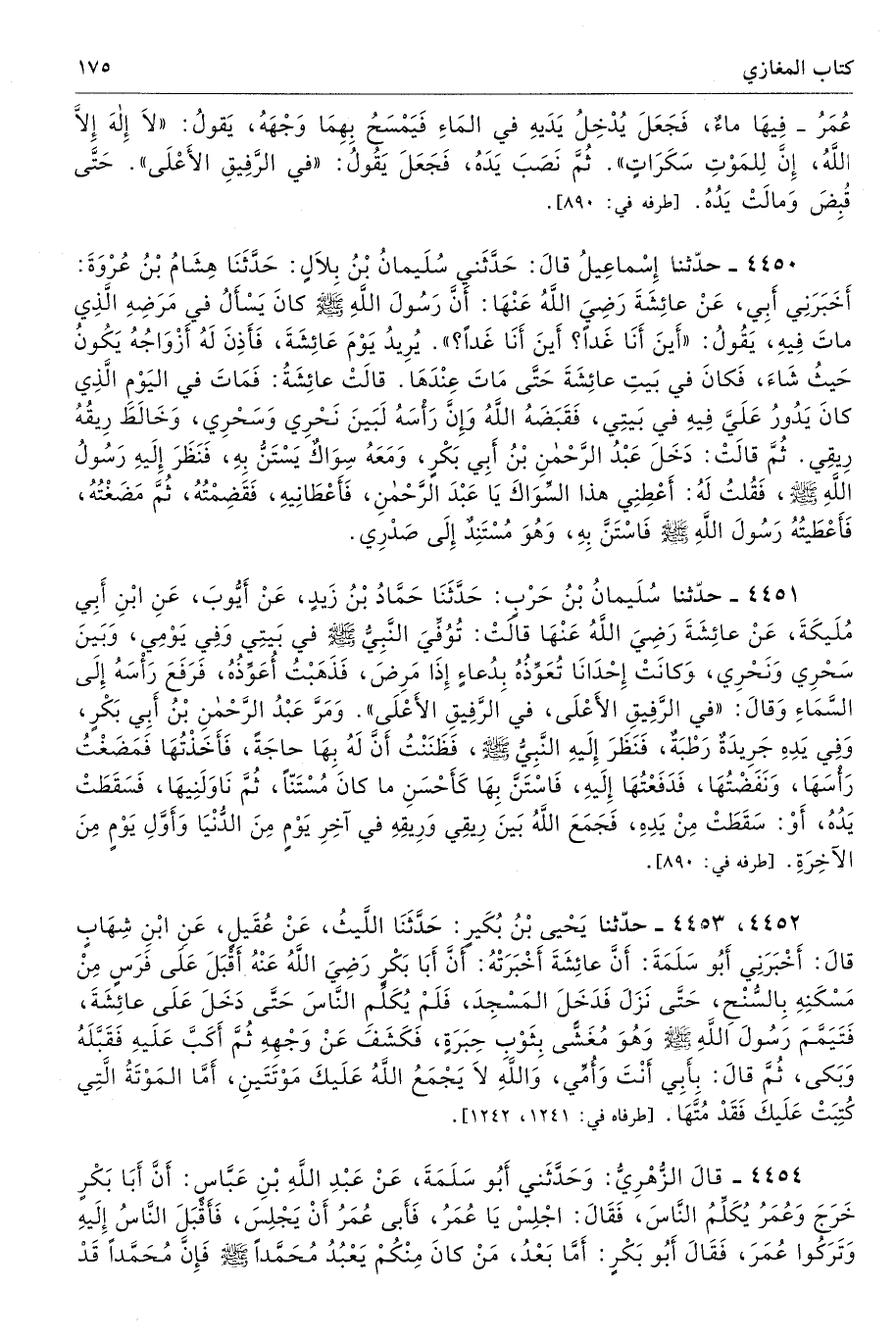 عُمَرُ - فِيهَا مَاءٌ، فَجَعَلَ يُدْخِلُ يَدَيْهِ فِى الْمَاءِ فَيَمْسَحُ بِهِمَا وَجْهَهُ يَقُولُ «لاَ إِلَهَ إِلاَّ اللَّهُ، إِنَّ لِلْمَوْتِ سَكَرَاتٍ». ثُمَّ نَصَبَ يَدَهُ فَجَعَلَ يَقُولُ «فِى الرَّفِيقِ الأَعْلَى». حَتَّى قُبِضَ وَمَالَتْ يَدُهُ. أطرافه 890، 1389، 3100، 3774، 4438، 4446، 4450، 4451، 5217، 6510 - تحفة 16076 - 16/ 6