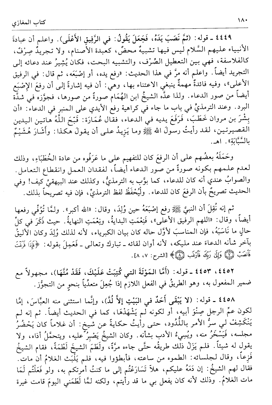 4449 - قوله: (ثمَّ نَصَبَ يَدَهُ، فَجَعَلَ يَقُولُ: في الرَّفِيقِ الأَعْلَى) واعلم أن عبادةَ الأنبياء عليهم السَّلام ليس فيها تشبيهٌ محضٌ، كعبدة الأصنام، ولا تجريدٌ صِرْفٌ، كالفلاسفة، فهي بين التعطيل الصِّرْف، والتشبيه البحث، فكان يُشِيرُ عند دعائه إلى التجريد أيضًا. واعلم أنه مرَّ في هذا الحديث: «رفع يده، أو إصْبَعَه، ثم قال: في الرفيق الأعلى»، وفيه فائدةٌ مهمةٌ ينبغي الاعتناء بها، وهي: أن فيه إشارةً إلى أن رفعَ الإِصْبَع أيضًا من صورالدعاء. ولذا عدَّه الشيخُ ابن الهُمَام صورةً من صورها، فجوَّزه في شدَّة البرد. وعند الترمذيِّ في باب ما جاء في كراهية رفع الأيدي في المنبر في الدعاء: «أن بِشْرَ بن مروان خَطَبَ، فَرَفَعَ يديه في الدعاء، فقال عُمَارَة: قَبَحَ اللَّهُ هاتين اليدين القصيرتين، لقد رأيتُ رسولَ الله صلى الله عليه وسلّم وما يَزِيدُ على أن يقولَ هكذا: وأَشَارَ هُشَيْمٌ بالسَّبَّابَةِ». اهـ.