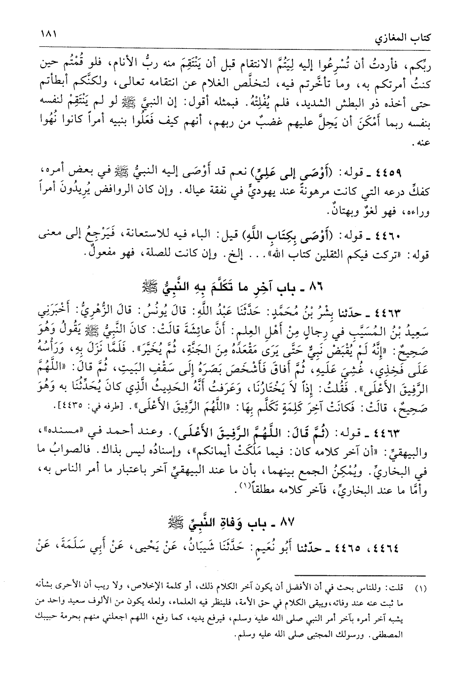 4463 - قوله: (ثُمَّ قَالَ: اللَّهُمَّ الرَّفِيقَ الأَعْلَى) وعند أحمد في «مسنده»، والبيهقيِّ: «أن آخر كلامه كان: فيما مَلَكَتْ أيمانكم»، وإسنادُه ليس بذاك. فالصوابُ ما في البخاريِّ. ويُمْكِنُ الجمع بينهما، بأن ما عند البيهقيِّ آخر باعتبار ما أمر الناس به، وأمَّا ما عند البخاريِّ، فآخر كلامه مطلقًا (¬1).