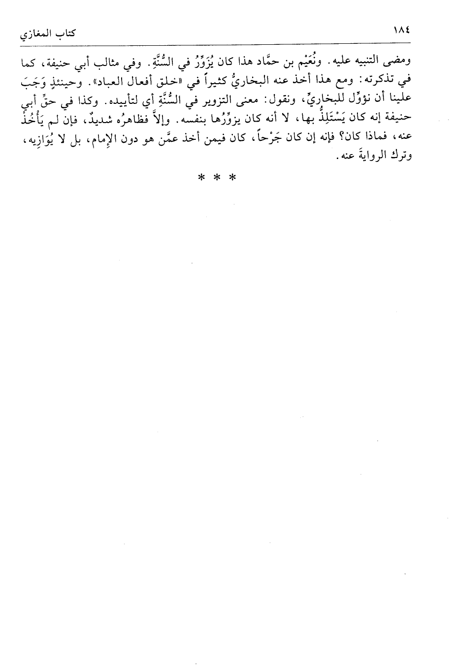 ومضى التنبيه عليه. ونُعَيْم بن حمَّاد هذا كان يُزَوِّرُ في السُّنَّةِ. وفي مثالب أبي حنيفة، كما في تذكرته: ومع هذا أخذ عنه البخاريُّ كثيرًا في «خلق أفعال العباد». وحينئذٍ وَجَبَ علينا نؤوِّل للبخاريِّ، ونقول: معنى التزوير في السُّنَّةِ أي لتأييده. وكذا في حقِّ أبي حنيفة إنه كان يَسْتَلِذُّ بها، لا أنه كان يزوِّرُها بنفسه. وإلَّا فظاهرُه شديدٌ، فإن لم يَأْخُذْ عنه، فماذا كان؟ فإنه إن كان جَرْحًا، كان فيمن أخذ عمَّن هو دون الإِمام، بل لا يُوَازِيه، وترك الروايةَ عنه.