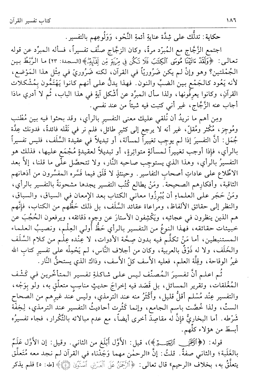 ومِن أهم ما نريدُ أن نُلقي عليك معنى التفسيرِ بالرأي، وقد بحثوا فيه بين مُطْنب ومُوجِز، مُكْثر ومُقلّ، غير أنه لا يرجع إلى كثيرِ طائل، فلم نر في نَقْله فائدةً، فدونك عِدَّة جُمَل: أنَّ التفسيرَ إذا لم يوجِب تغييرًا لمسألة، أو تبديلًا في عقيدة السَّلَف، فليس تفسيرًا بالرأي، فإِذا أوجب تغييرًا لمسألةٍ متواتِرةٍ، أو تبديلًا لعقيدةٍ مُجْمَعٍ عليها، فذلك هو التفسيرُ بالرأي، وهذا الذي يستوجِب صاحبه النَّار، ولا تتحصَّل على ما قلنا، إلَّا بعد الإطِّلاع على عاداتِ أصحابِ التفاسير. وحينئذٍ لا قَلَق فيما فَسَّره المفسِّرون من أذهانهم الثاقبة، وأفكارِهم الصحيحة. ومَنْ يطالع كُتُب التفسير يجدها مشحونةً بالتفسير بالرأي، ومَنْ حَجَر على العلماءِ أن يُبْرِزُوا معاني الكتاب بعد الإِمعان في السياق، والسباق، والنظر إلى حقائق الألفاظ، ومراعاة عقائد السَّلَف، بل ذلك حَظُّهم من الكتاب، فإِنَّهم هم الذين ينظرون في عجائبه، ويَكْشِفون الأستارَ عن وجوه دَقائقه، ويرفعون الحُجُبَ عن خبيئات حقائقه، فهذا النوعُ من التفسير بالرأي حَظُّ أُولي العِلْم، ونصيبُ العلماء المستنبطين، أما مَنْ تكلَّم فيه بدون صِحَّة الأدوات، لا عِنْده عِلْم من كلام السَّلَف والخَلَف، ولا له ذُوْقٌ بالعربية، وكان من أجلاف النَّاس، لم يَحْمِلْه على تفسيرِ كتابِ الله غيرُ الوقاحة، وقِلَّة العلم، فعليه الأَسف كلّ الأَسف، وذاك الذي يستحقُّ النَّار.
