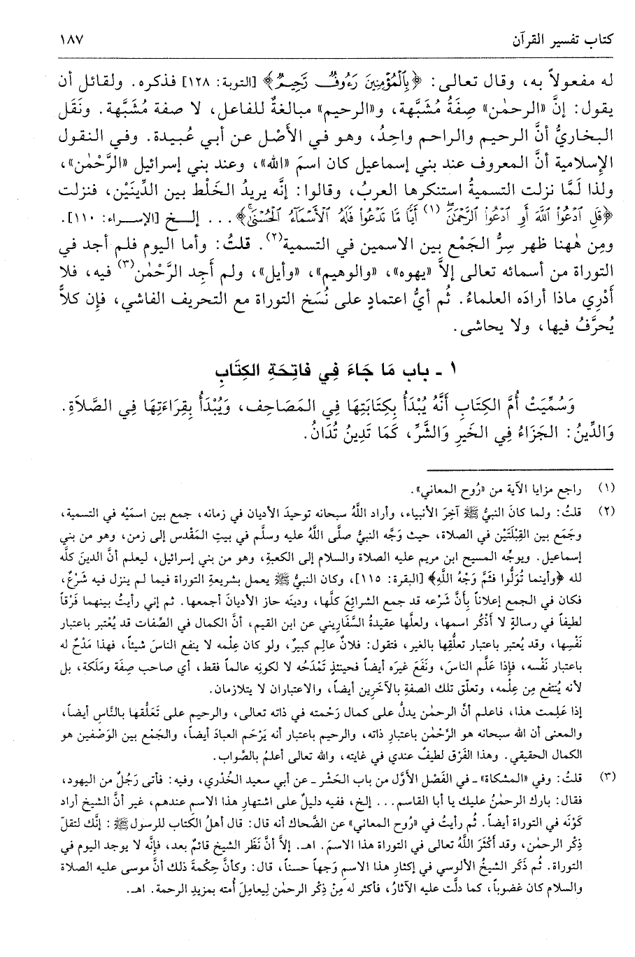 ومِن ههنا ظهر سِرُّ الجَمْع بين الاسمين في التسمية (¬2). قلتُ: وأما اليوم فلم أجد في التوراة من أسمائه تعالى إلَّا "يهوه"، "والوهيم"، "وأيل"، ولم أَجِد الرَّحْمن (¬3) فيه، فلا أَدْرِي ماذا أرادَه العلماءُ. ثُم أيُّ اعتمادٍ على نُسَخ التوراة مع التحريف الفاشي، فإِن كلًّا يُحرَّفُ فيها، ولا يحاشى.