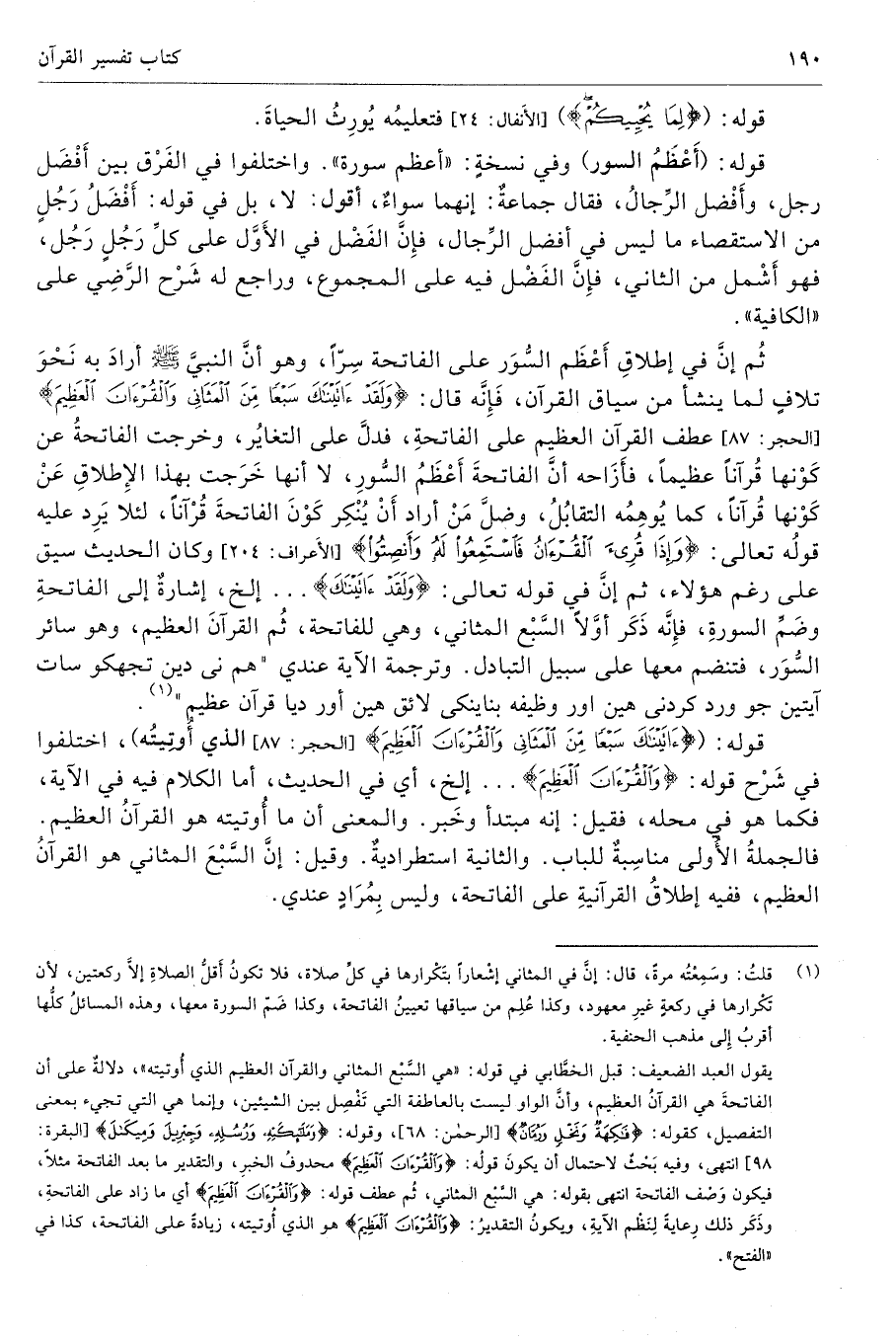 قوله: (أَعْظَمُ السور) وفي نسخةٍ: «أعظم سورة». واختلفوا في الفَرْق بين أَفْضَل رجل، وأَفْضل الرِّجالُ، فقال جماعةٌ: إنهما سواءٌ، أقول: لا، بل في قوله: أَفْضَلُ رَجُلٍ من الاستقصاء ما ليس في أفضل الرِّجال، فإِنَّ الفَضْل في الأَوَّل على كلِّ رَجُلٍ رَجُل، فهو أَشْمل من الثاني، فإِنَّ الفَضْل فيه على المجموع، وراجع له شَرْح الرَّضِي على «الكافية».